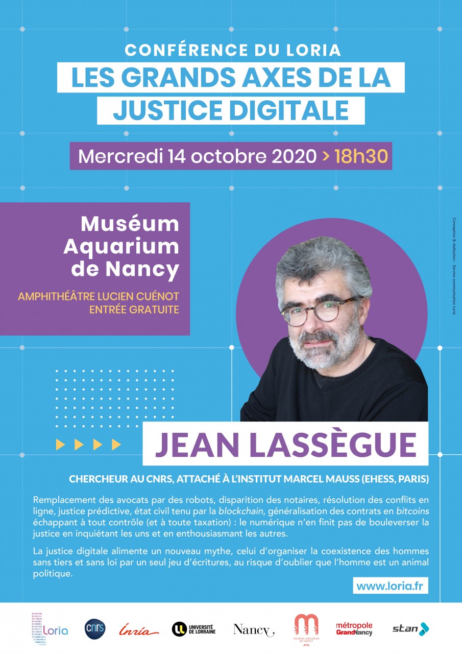 Dans le cadre du Colloquium Loria, Jean Lassègue donnera une conférence exceptionnelle mercredi 14 octobre à 18h30, au Muséum Aquarium de Nancy, amphithéâtre Lucien Cuénot. La présentation s’articulera autour de la justice digitale et sera en français. Jean Lassègue est chercheur au CNRS, attaché à l’Institut Marcel Mauss (EHESS Paris), membre statutaire du LIAS.