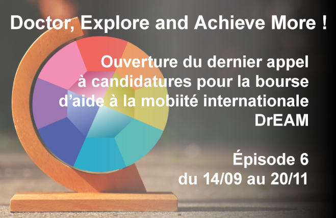 Le sixième et dernier épisode de ce dispositif se déroulera du 14 septembre au 20 novembre prochain. Les doctorants inscrits à l’UL ayant un projet de mobilité internationale sont invités à déposer leur candidature auprès de la Maison du Doctorat. Le règlement et le formulaire de candidature sont disponibles, en français et en anglais, sur la page DrEAM du site web du doctorat : http://doctorat.univ-lorraine.fr/fr/international/dream