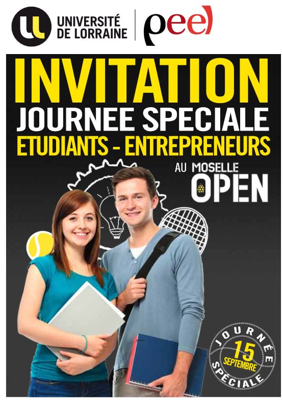 Venez participer le lundi 15 septembre à la Journée spéciale étudiants-entrepreneurs, organisée par le PEEL ( le Pôle entrepreneuriat étudiant de Lorraine de l’Université de Lorraine) au Moselle Open de tennis aux Arènes de METZ.