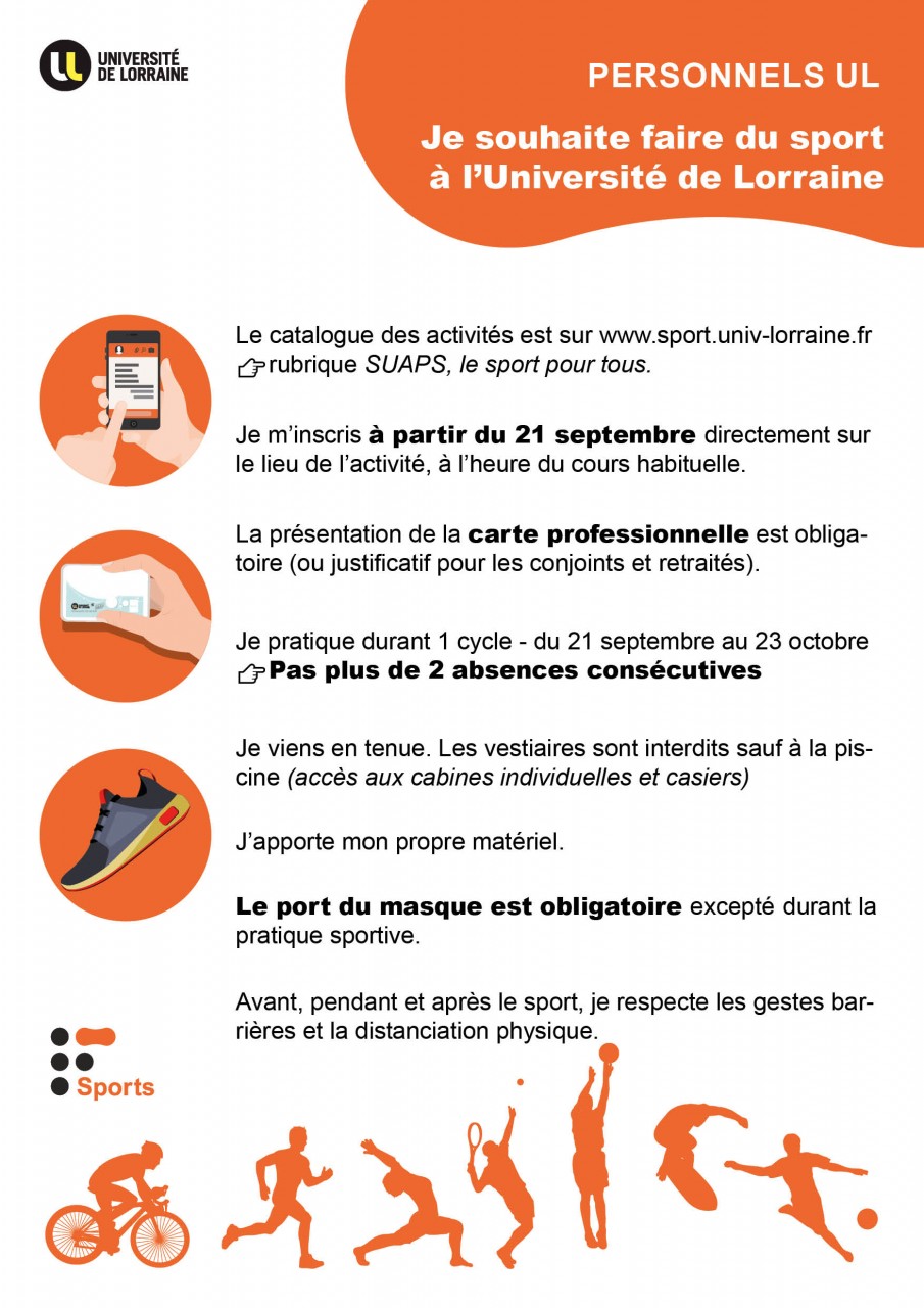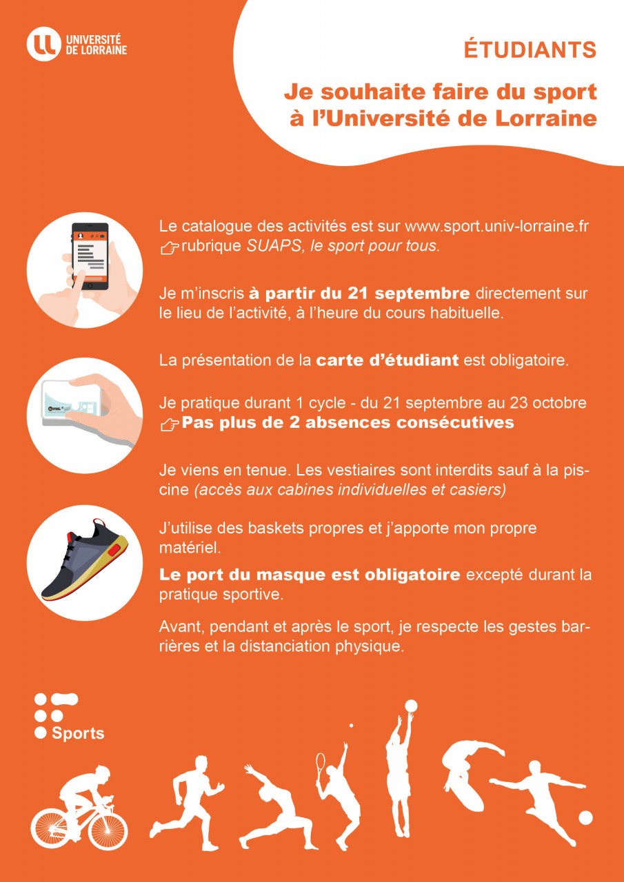 Que vous soyez étudiant ou personnel, découvrez quelles sont les règles à respecter pour venir pratiquer le sport en toute sécurité et rendez-vous sur http://sport.univ-lorraine.fr/fr/suaps-le-sport-loisir-pour-tous pour découvrir le programme !