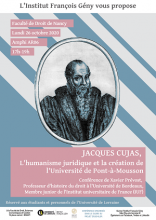 La création de l’université de Pont-à-Mousson en 1572 et l’institutionnalisation de sa faculté des droits dix ans plus tard ont lieu au moment où, à travers toute l’Europe et en particulier dans le royaume de France, ces facultés sont bousculées par le renouvellement des méthodes dû à l’humanisme juridique. Ce phénomène intellectuel de la Renaissance vient, sans doute, de connaître son apogée, marqué par des jurisconsultes à la réputation européenne, parmi lesquels émerge la figure dominante de Jacques Cujas (1522-1590). Pressenti par Charles III pour devenir le premier doyen de la faculté des droits, Cujas n’a jamais enseigné dans le duché de Lorraine, mais l’étude de la production cujacienne replacée au sein de l’humanisme juridique permet de comprendre le contexte dans lequel d’autres juristes humanistes – Guillaume Barclay (v.1546-1608) et Pierre Grégoire (1540-1597) – ont forgé l’institution mussipontaine.