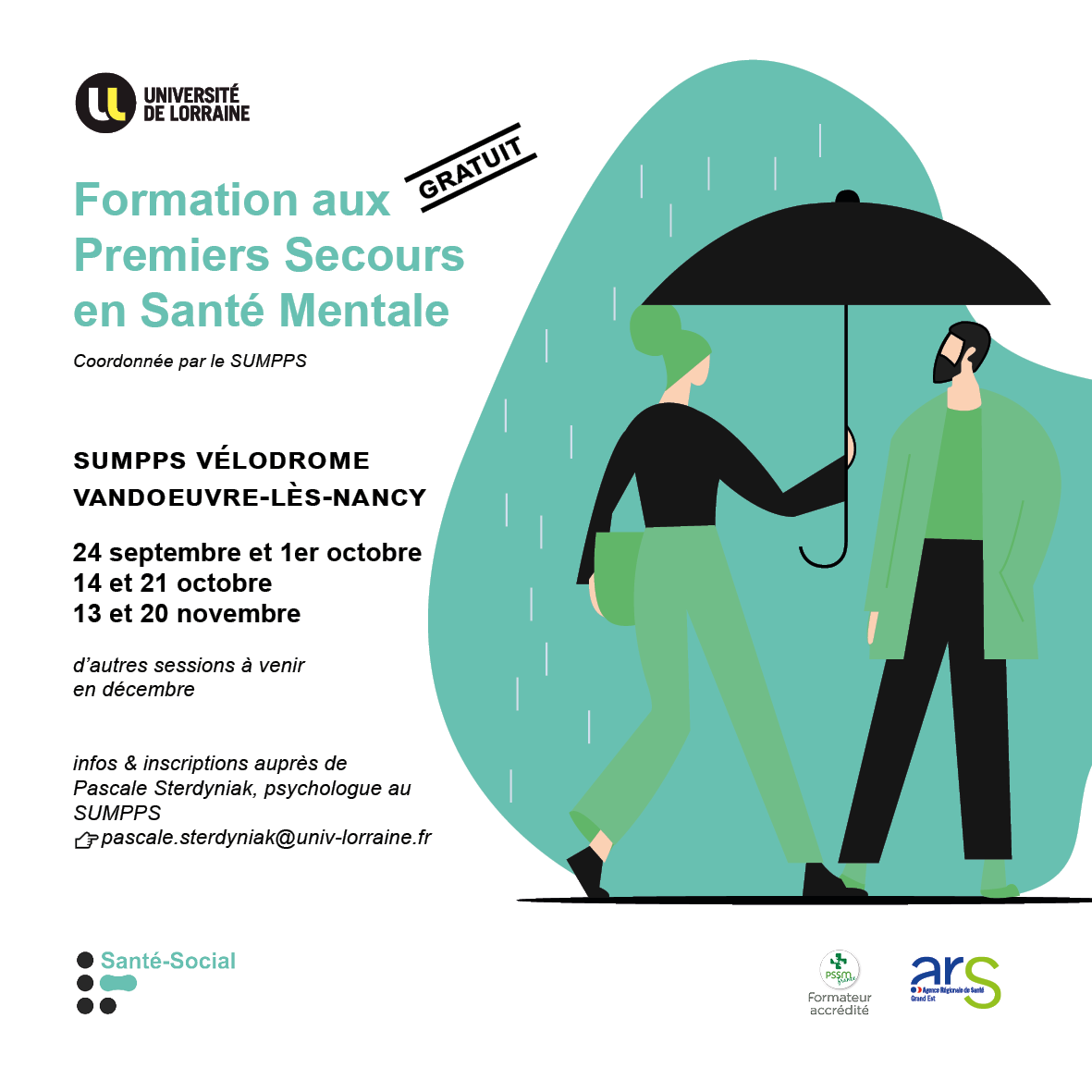 Infos et inscriptions auprès de Pascale Sterdyniak, psychologue au SUMPPS par e-mail à pascale.sterdyniak@univ-lorraine.fr