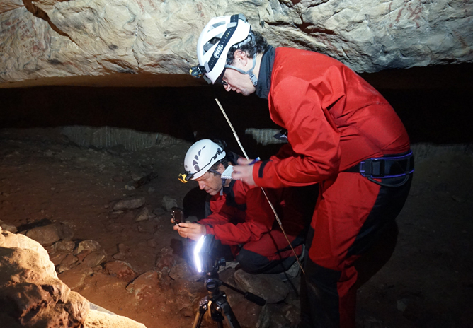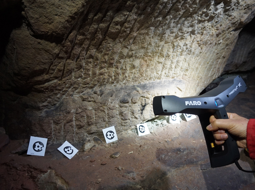 La méthode employée vise à recenser puis à analyser les traces visibles : traces d’outils, traces fonctionnelles, comme les trous d’accrochage des lampes à suif, et graffiti. L’utilisation du scanner 3D, dont le laboratoire HisCAnt-MA s'est doté, a été déployé dans les réseaux souterrains par M. Caltagirone (HisCAnt-MA) assisté de J. Klosset (ERMINA) : plusieurs fronts de taille caractéristiques des techniques d’abattage utilisées au fil du temps ont été ciblés. Traces de pointerolles, de keils (coins), de pic ou de barres en métal, les traces d’outils sont omniprésentes et constituent ici des marqueurs incontournables pour appréhender l’évolution technologique et la dynamique générale de l’exploitation sur le plan chronologique. La répartition des traces sur les relevés topographiques permet en effet de valider les stratégies d’exploitation mises en œuvre en lien avec l’architecture de la mine dont la configuration reflète en partie la géométrie originelle des concentrations minéralisées.