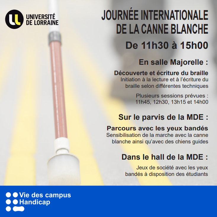 En partenariat avec le service handicap et le G.I.A.A. (Groupement des Intellectuels Aveugles et Amblyopes), de nombreuses activités autour de la cessité visuelle seront proposées : découverte et écriture du braille, parcours les yeux bandés, parcours chiens-guides d'aveugles, jeux de société, etc.