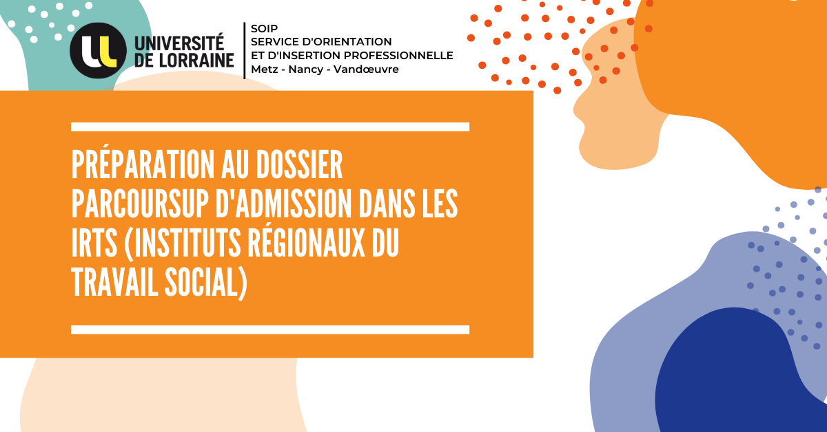 Alors, ne manquez pas la réunion d'information (à distance via Teams), lundi 23 novembre 2020, sur les modalités d’inscription à l’IRTS (Institut régional du travail social de Lorraine) et sur la préparation au dossier de candidature sur Parcoursup et à l'oral d'admission, organisée par le SOIP-Nancy (Service d'orientation et d'insertion professionnelle).