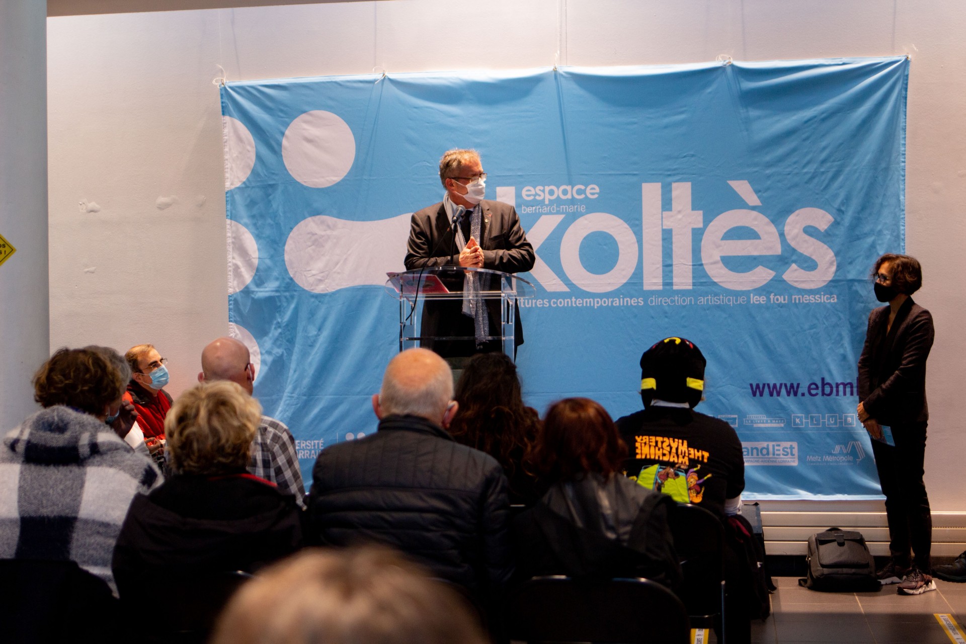 Le Président de l’Université de Lorraine, Pierre Mutzenhardt, a introduit la cérémonie en affirmant la nécessité de ne pas renoncer à la culture dans le contexte actuel. Il a souligné le dynamisme et l’ouverture apportés au théâtre par Lee Fou Messica, directrice artistique, et son équipe.