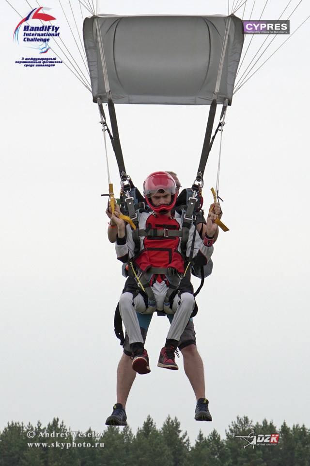 M.G. : Pour un simple baptême il faut enfiler un harnais qui est relié au moniteur pour ne faire qu’un. Ensuite le moniteur vous briefe pendant 10-15 minutes afin d’expliquer les étapes du saut. La seule spécificité pour les handi est qu’il faut ajouter une combinaison pour pouvoir remonter les jambes lors de l’atterrissage.