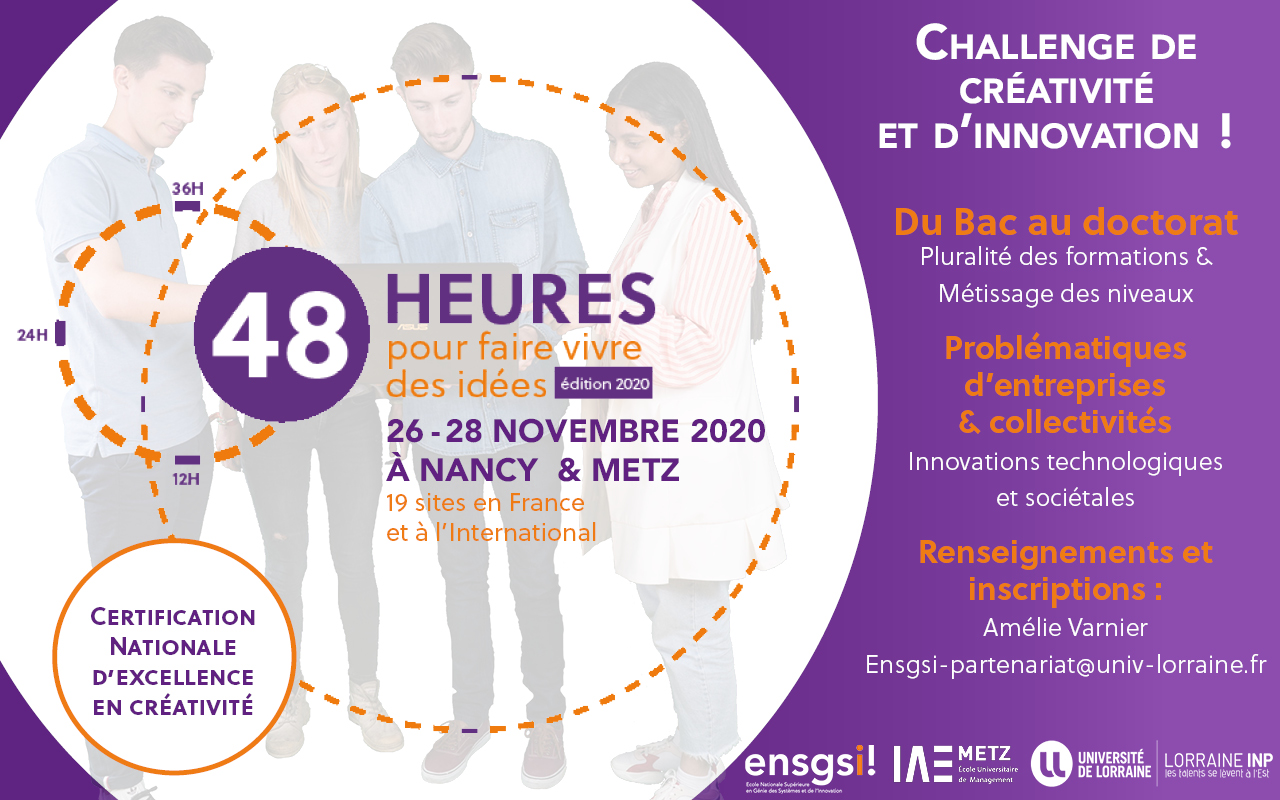 Du 28 au 30 novembre 2020, l’Ecole Nationale Supérieure en Génie des Systèmes et de l’Innovation – ENSGSI - lancera l'édition 2020 de son dispositif pédagogique international « 48 heures pour faire vivre des idées® » en partenariat avec l’IAE Metz.