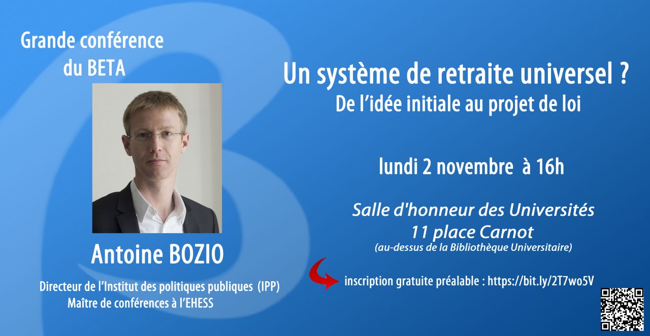 Les Grandes Conférences (https://www.facebook.com/BETAconf/) sont un évènement organisé depuis 2013 par le Beta Lorraine (UMR 7522), laboratoire d'économie de l'Université de Lorraine. Nous invitons chaque année des économistes renommé.e.s à donner une conférence grand public dans les murs de la Faculté Droit/Economie de Nancy. Cet évènement est ouvert à toutes et à tous, économistes amateurs ou confirmés: étudiant.e.s, enseignant.e.s, personnels administratifs, mais également à un public extérieur à l'Université, avec le désir de rendre accessible les apports récents des sciences économiques.