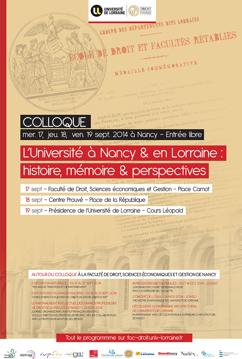Le colloque "L'Université à Nancy et en Lorraine : histoire, mémoire et perspectives" aura lieu les 17,18 et 19 septembre 2014. Associé à plusieurs manifestations et initiatives, il est organisé à l'occasion du cent cinquantenaire du rétablissement de la Faculté de Droit, en 1864. Il permet de mettre en évidence le rôle de personnalités du monde universitaire et propose d'analyser les caractéristiques, les temps forts, les initiatives et les enjeux liés à l'histoire et au patrimoine de l'Université, du dernier tiers du XIXe siècle à nos jours. En outre, les nombreux changements et les coopérations qui ont récemment conduit à la création de l'Université de Lorraine sont abordés. Ainsi, sont réunies des contributions relevant de plusieurs composantes de l'Université et d'une réflexion sur son devenir, à laquelle prennent aussi part témoins et acteurs. Le colloque, tout en rendant compte de spécificités nationales, se situe donc à l'échelle urbaine et régionale, ainsi que dans le cadre de l'Europe de l'enseignement supérieur et de la recherche.