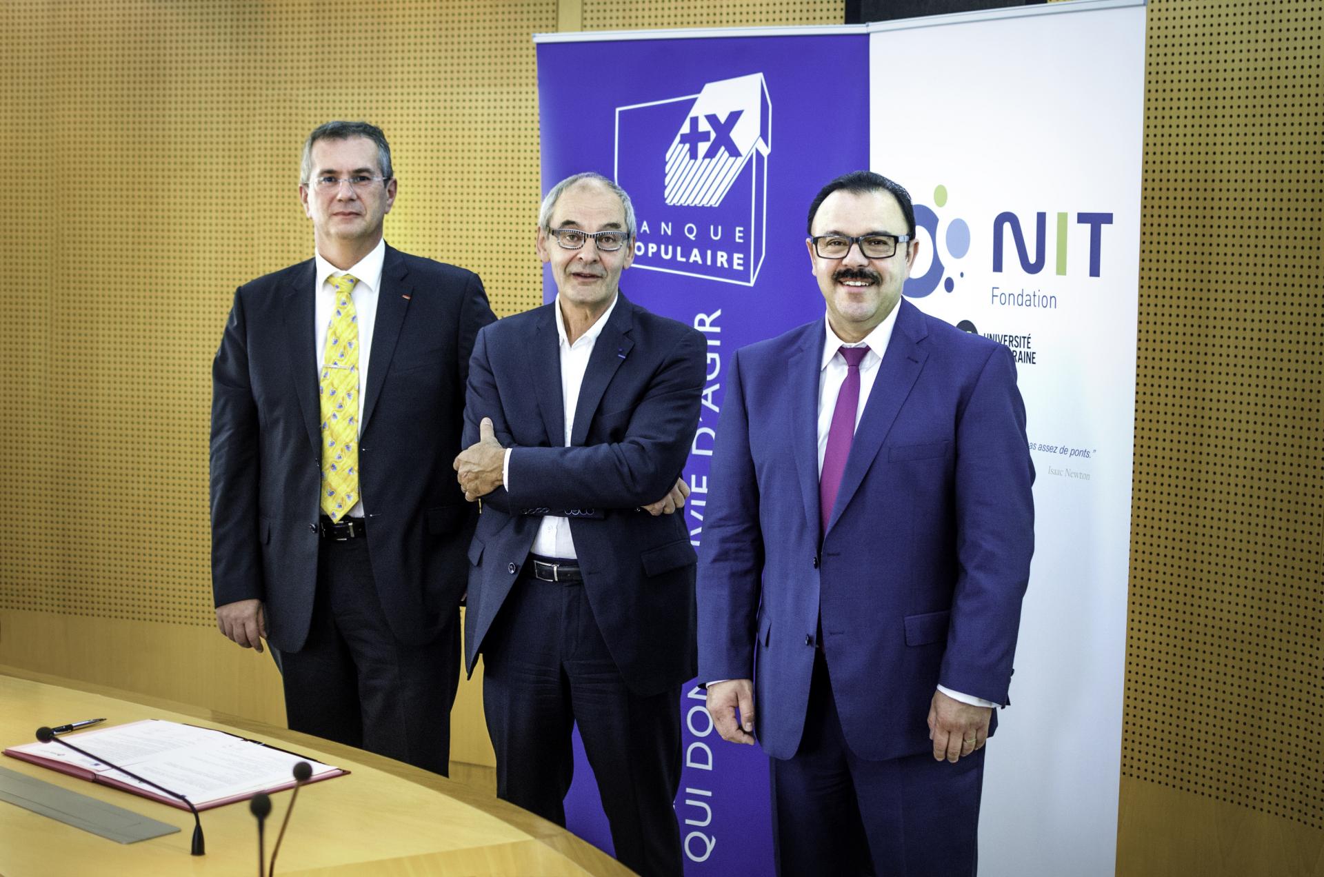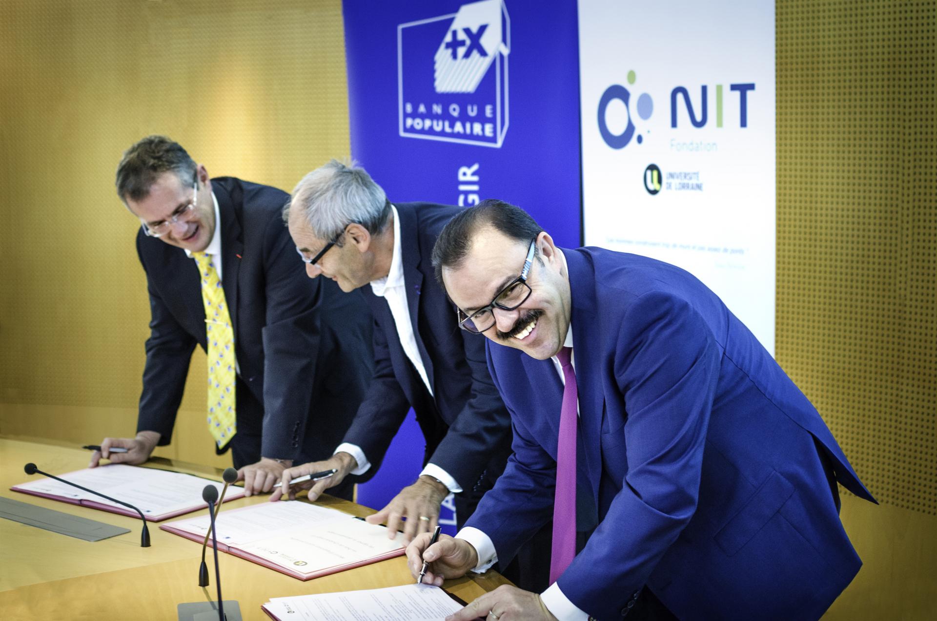 Mercredi 3 septembre, Dominique WEIN, Directeur Général de la Banque Populaire Lorraine Champagne (BPLC), Pierre MUTZENHARDT, Président de l’Université de Lorraine (UL) et François LAURENT, Président de la Fondation NIT de l’UL, ont officiellement signé une convention de mécénat au titre de laquelle la BPLC a effectué à l’Université de Lorraine et plus particulièrement à la « Fondation NIT » le don d’un matériel de haute technologie, une machine d’essai d’impact ou de choc utilisée pour caractériser les déformations de divers matériaux et composants, un don d’un montant de 100 000 euros.