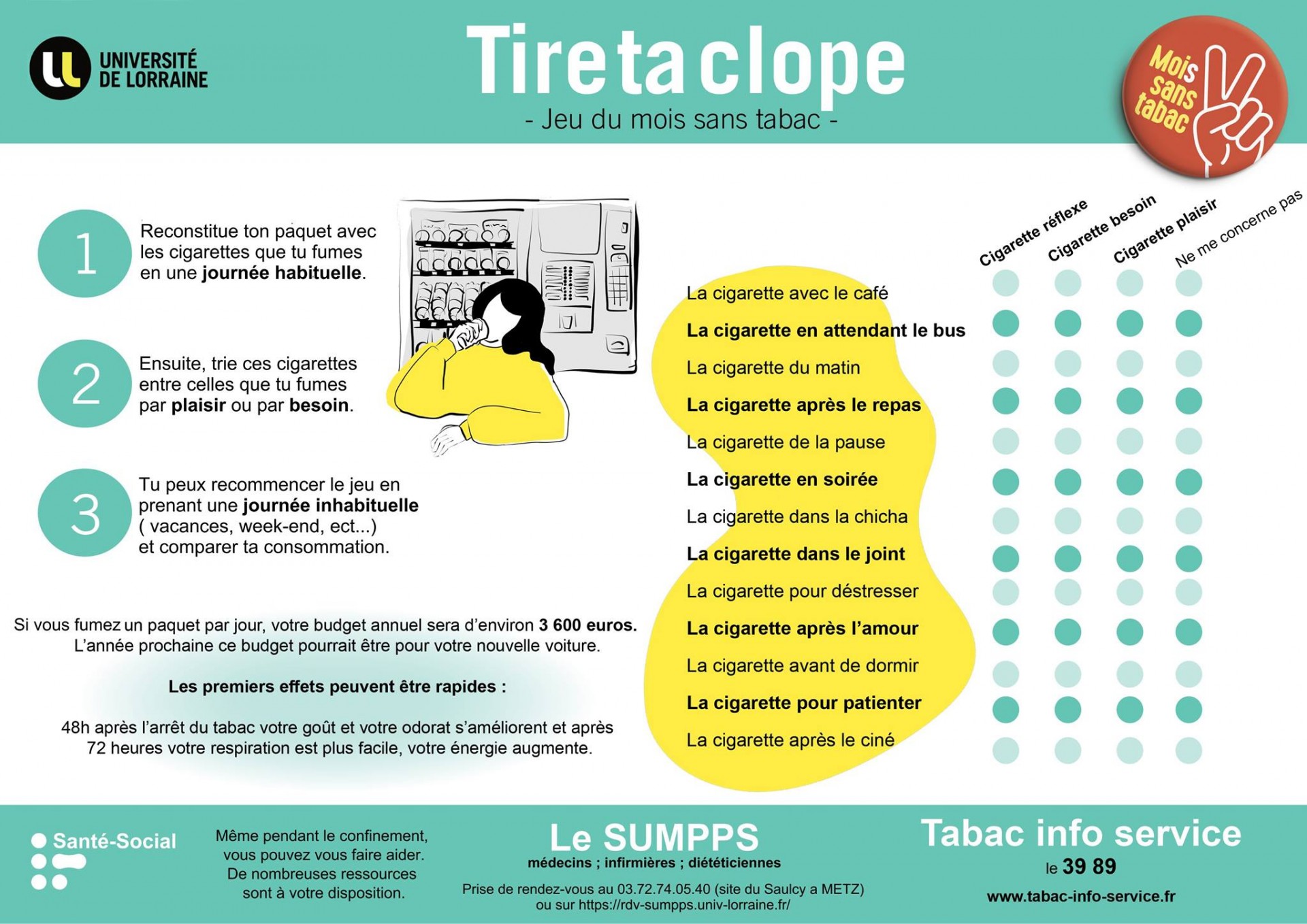 Dans le cadre du Mois sans Tabac, les étudiants relais du SUMPPS vous proposent une version numérique du jeu Tire ta Clope.