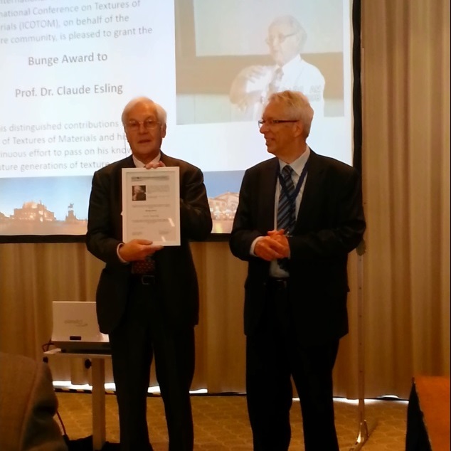 The International Committee of ICOTOM, on behalf of the texture community, is pleased to grant theBunge Award to Prof. Dr. Claude ESLING, in recognition of his distinguished contributions in the field of textures of materials and his continuous effort to pass his knowledge to the future generations of texture researchers