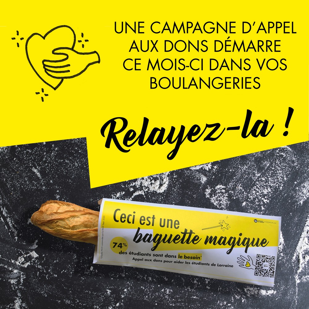 Les dons récoltés bénéficieront prioritairement aux étudiants en soutenant les AGORAés pour maintenir leurs stocks. Pour la première fois, nous avons communiqué cet appel de fonds au-delà des communautés proches de l'Université de Lorraine, dans les boulangeries, en utilisant le support des sacs à pain. Le message vise à sensibiliser le grand public à cette situation et à encourager les dons en ligne ou en utilisant le bulletin figurant au verso du support. Vous pourrez les retrouver dans les boulangeries de Nancy et Metz. Parallèlement, la campagne sera diffusée sur les réseaux sociaux de l'Université de Lorraine et ceux de la Fondation NIT ainsi que sur les écrans des agences de la banque Populaire partout en Lorraine.