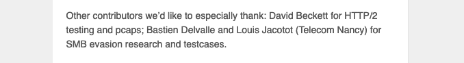 Lors de la publication en octobre de la version 6.0.0 de Suricata, l’équipe de développement du logiciel a remercié publiquement les élèves pour leur recherche sur le protocole SMB et la mise à disposition de tests qui permettent de vérifier la résistance des prochaines versions de Suricata aux évasions découvertes.