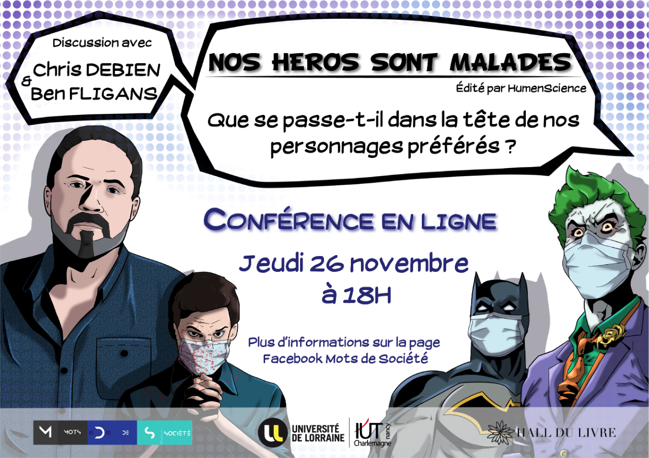 Dans le cadre du cycle de conférences Mots de Société organisé par les étudiants en 2ème année de DUT Métiers du Livre à l'IUT Charlemagne, nous accueillons le 26 novembre prochain le psychiatre et auteur de fiction Christophe DEBIEN et son collaborateur Ben FLIGANS pour un échange en ligne autour de leur nouveau livre qui vient de paraître aux éditions HumenSciences: Nos Héros sont Malades. Dans ce nouvel ouvrage, l’auteur s’intéresse à la représentation des maladies psychiatriques au travers de personnages de la Pop Culture, et leur influence sur notre vision des maladies dans la vraie vie. S'appuyant sur des films ou séries que nous connaissons tous, Christophe DEBIEN décode les maladies psychiatriques et s’efforce d’apporter des éléments de réponse à cette question que nous nous posons : Que se passe-t-il dans la tête de nos personnages préférés ?