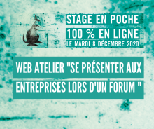 Le forum « Stage en poche 100% en ligne » approche (mardi 8 décembre) et pour vous aider à l’aborder au mieux, plusieurs ateliers EN LIGNE « Savoir se présenter aux recruteurs lors d’un forum » vous sont proposés.
