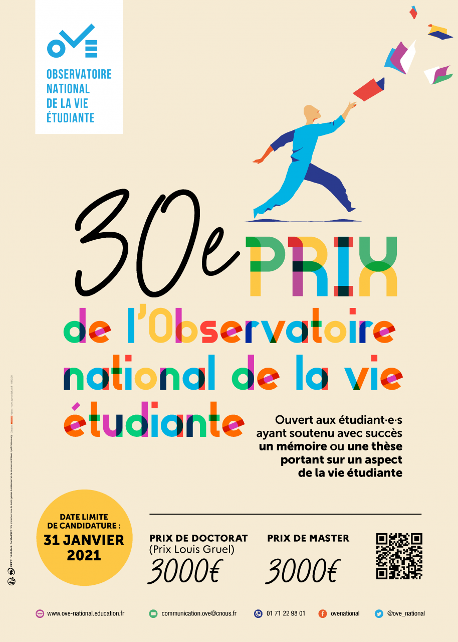 Destiné à encourager les recherches sur les conditions de vie des étudiant·e·s, le concours de l'OVE récompense les meilleurs travaux grâce à un prix de master et un prix de doctorat (prix Louis Gruel), d’une valeur de 3 000 euros chacun.