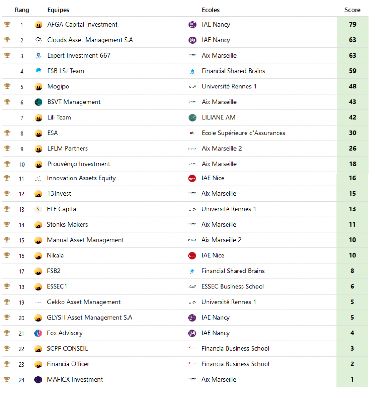 Du 26 octobre 2020 au 26 mars 2021, 66 équipes d'étudiant(e)s de Grandes écoles et d'Universités vont s'affronter lors de la quatrième édition d'une compétition unique en Europe permettant de mettre en valeur leurs connaissances financières, leurs maîtrises des risques et leurs savoir-faire en matière d'allocations dans le cadre de la gestion de 3 portefeuilles virtuels pour trois catégories d'investisseurs. Un trophée et un prix sera remis aux 3 premières équipes des 6 challenges le 26 mars prochain.