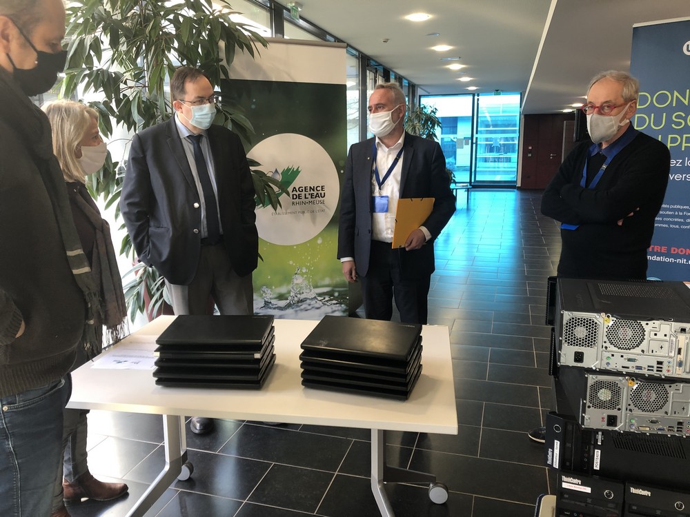 Si la fondation récolte en général des dons financiers, c'est cette fois un don d'ordinateurs que l'Agence de l'Eau Rhin-Meuse a décidé d' attribuer pour lutter contre l'isolement numérique des étudiants. 211 ordinateurs, fixes et portables, seront livrés en cette fin d'année et au tout début d'année prochaine. Cette initiative permettra de favoriser l'accès aux enseignements dispensés en ligne, aux ressources pédagogiques disponibles ainsi qu'à la réalisation des projets des étudiants. François Laurent (Président) et Vincent Queudot (Secrétaire Général) de la fondation sont allés personnellement retirer les vingt premiers matériels à l'Agence de l'Eau Rhin-Meuse et remercier son directeur général, Marc Hoeltzel, le 16 décembre 2020. Le président de l'agence a mentionné l'accord unanime de son conseil d'administration pour servir cette cause et a formulé ses vœux pour que cette action soit la première d'une collaboration plus large.