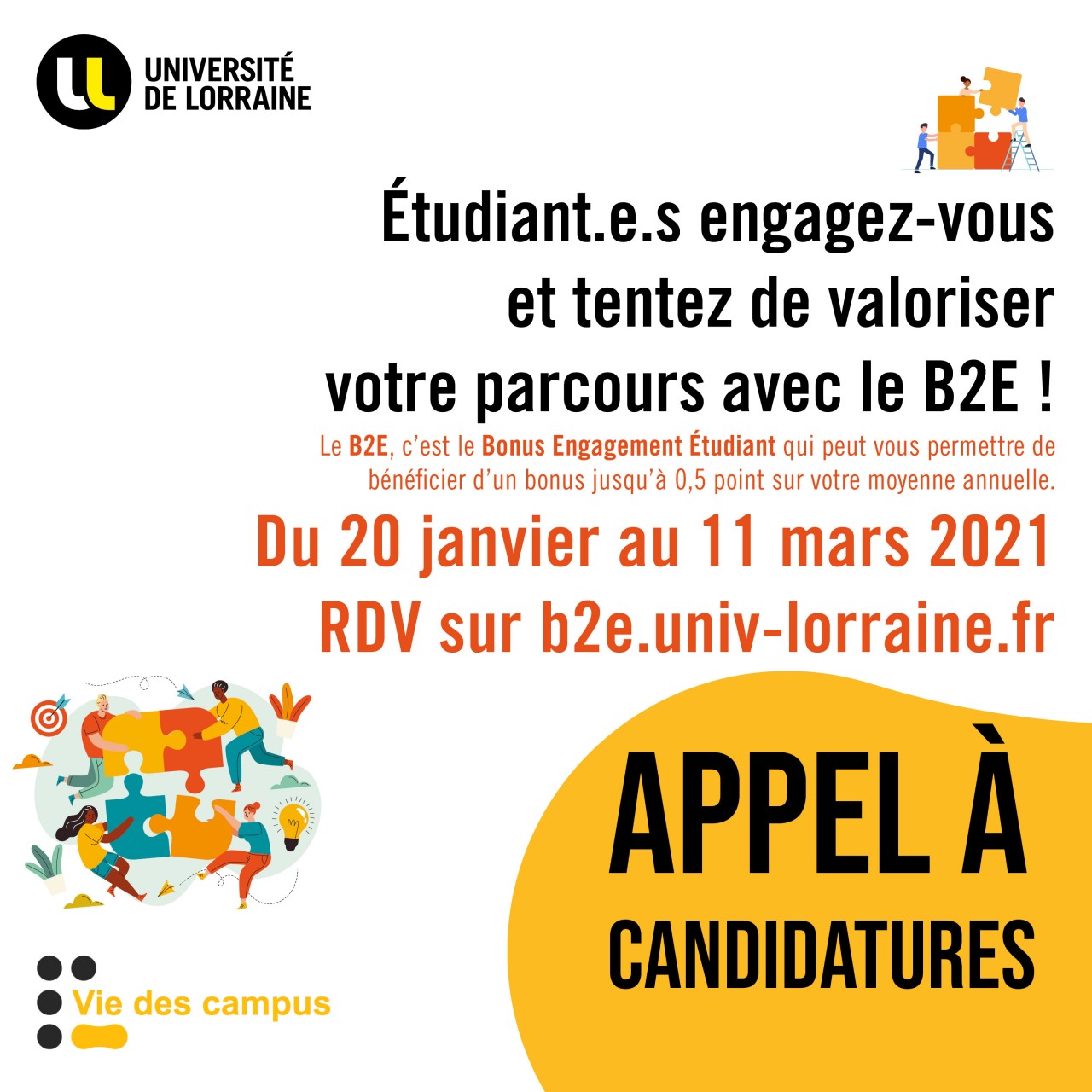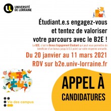 A l’université de Lorraine cet engagement peut être valorisé au titre du bonus engagement étudiant, le « B2E » : ce dispositif vous permet d’obtenir jusqu’à 0,5 point sur votre moyenne.