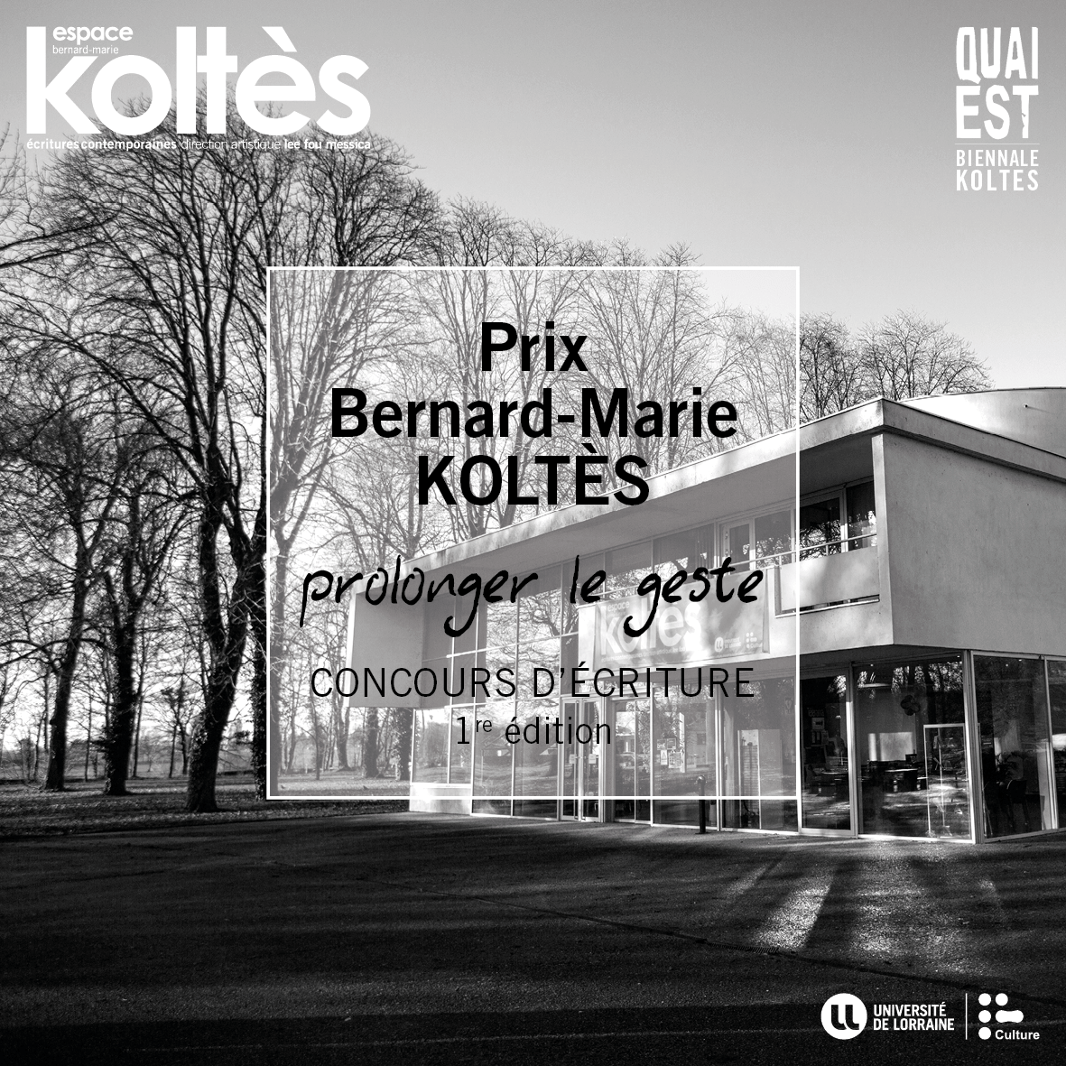 L’association Quai Est – Biennale Koltès, présidée par M. Richard Bance, fondée pour soutenir les recherches universitaires portant sur l’œuvre de B.M. Koltès et sur le théâtre contemporain, et l’Espace Bernard-Marie Koltès – Metz – Scène conventionnée d’intérêt national – Art et Création situé sur le campus du Saulcy et dirigé par Lee Fou Messica, se sont réunis pour soutenir les jeunes écritures contemporaines et francophones, en créant le prix "Bernard-Marie Koltès - Prolonger le geste". Par ce prix, les organisateurs récompenseront et soutiendront un auteur ou une autrice et une écriture dramatique contemporaine jamais publiée.