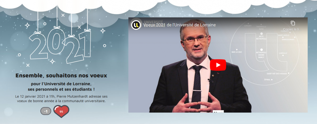 Un problème technique au moment du live n'a pas permis à tous ceux qui le souhaitaient d'accéder à cette vidéo donc découvrez-la et ensemble, souhaitons nos voeux pour l’Université de Lorraine, ses personnels et ses étudiants !