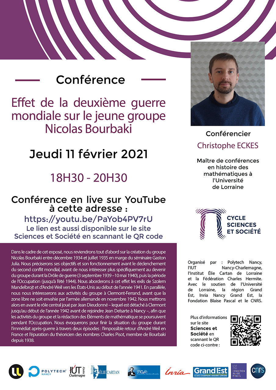 Résumé de la conférence : Dans le cadre de cet exposé, nous reviendrons tout d’abord sur la création du groupe Nicolas Bourbaki entre décembre 1934 et juillet 1935 en marge du séminaire Gaston Julia. Nous préciserons ses objectifs et son fonctionnement avant le déclenchement du second conflit mondial, avant de nous intéresser plus spécifiquement au devenir du groupe durant la Drôle de guerre (3 septembre 1939 –10 mai 1940), puis la période de l’Occupation (jusqu’à l’été 1944). Nous aborderons à cet effet les exils de Szolem Mandelbrojt et d’André Weil vers les États-Unis au début de l’année 1941. En parallèle, nous nous intéresserons aux activités du groupe à Clermont-Ferrand, avant que la zone libre ne soit envahie par l’armée allemande en novembre 1942. Nous mettrons alors en avant le rôle central joué par Jean Dieudonné – lequel est détaché à Clermont jusqu’au début de l’année 1942 avant de rejoindre Jean Delsarte à Nancy –, afin que les activités du groupe et la rédaction des Éléments de mathématique se poursuivent pendant l’Occupation. Nous évoquerons pour finir la situation du groupe durant l’immédiat après-guerre à travers deux épisodes : l’impossible retour d’André Weil en France et l’épuration du théoricien des nombres Charles Pisot, membre de Bourbaki depuis 1938.