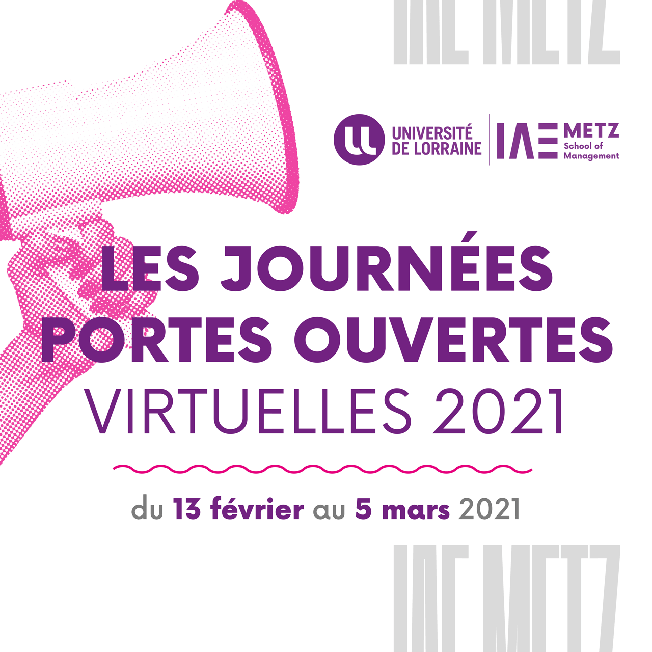 Cette année, l’IAE Metz School of Management vous propose 3 semaines dédiées aux portes ouvertes (virtuelles) à partir du 13 février 2021 jusqu’au 5 mars !
