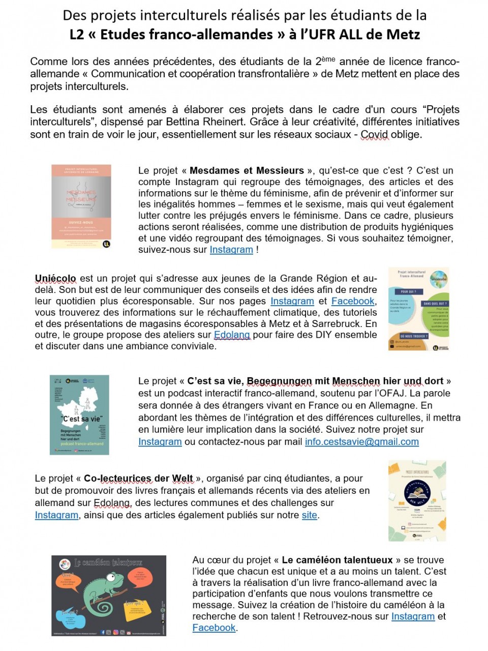 Comme lors des années précédentes, des étudiants de la 2ème année de licence franco-allemande « Communication et coopération transfrontalière » de Metz mettent en place des projets interculturels.