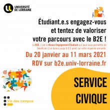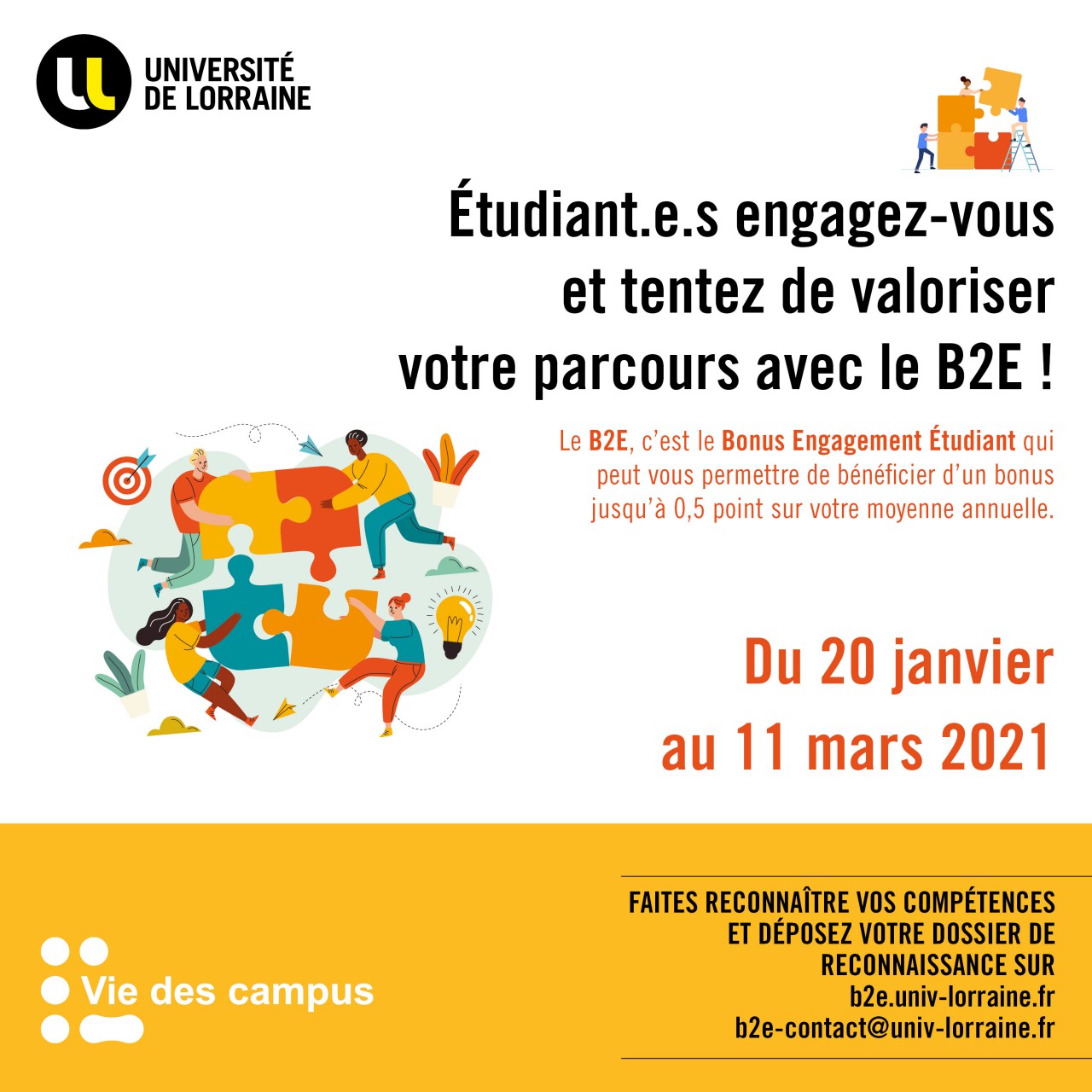 Pour connaître tous les détails sur les activités prises en compte et les modalités de dépôt de dossier, rendez-vous sur http://www.univ-lorraine.fr/B2E