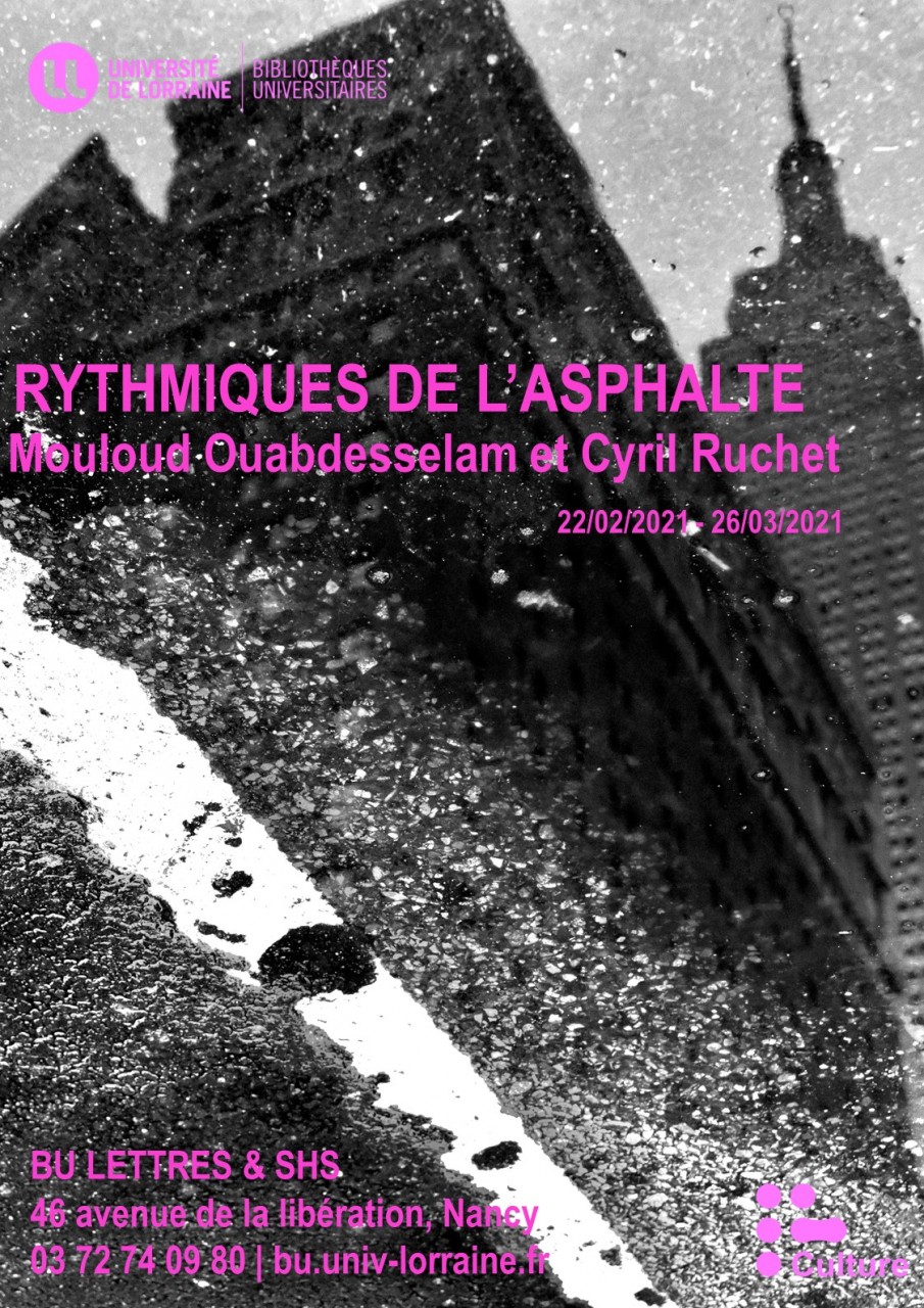 Mouloud Ouabdesselam et Cyril Ruchet présentent une exposition Rythmiques de l'asphalte du 22 février 2021 au 26 mars 2021 à la Bibliothèque universitaire de lettres, sciences humaines et sociales de Nancy en salle d'exposition du rez-de-chaussée.
