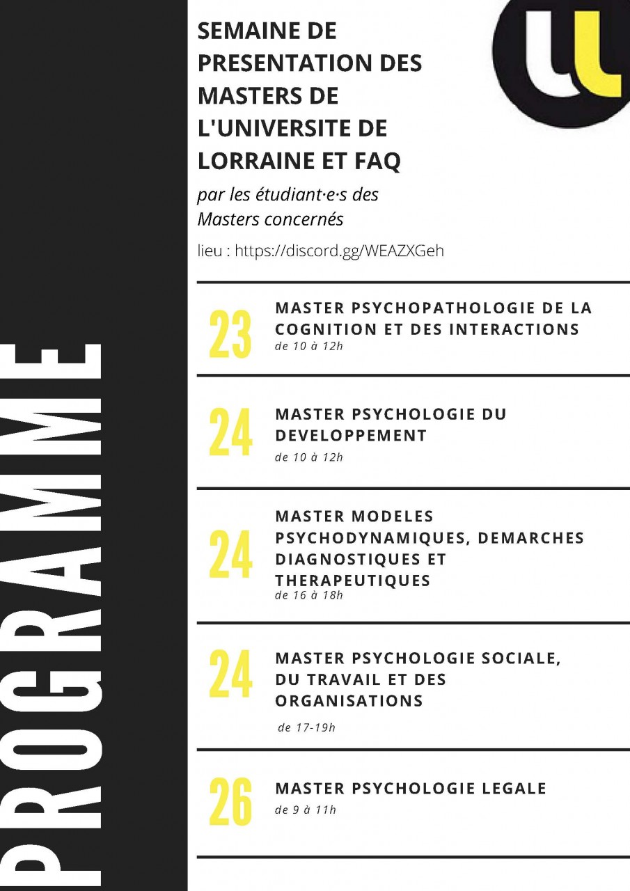 Les tutrices et tuteurs ainsi que les étudiantes et étudiants des Masters de Psychologie à Nancy, organisent une "semaine thématique" afin de présenter les cursus en vue des candidatures.