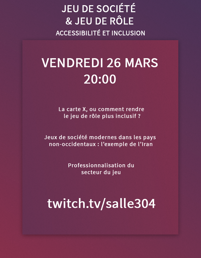 Le thème de la soirée portera sur l’inclusion et l’accessibilité du jeu de rôle et du jeu de société. Au programme : table ronde et chroniques individuelles autour du jeu de société en Iran, de la X Card dans le jeu de rôle et des cursus pour accéder aux métiers de ce secteur.