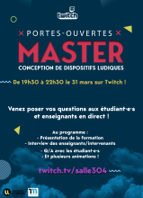 Le mercredi 31 mars, les étudiant·e·s du Master AMINJ, parcours CDL (Conception de dispositifs ludiques) organisent une soirée portes ouvertes en ligne sur Twitch ! Au programme ; des interviews avec les enseignants, des animations et du temps pour poser toutes vos questions. L'objectif de cette soirée est de présenter la formation et vous donner une idée assez précise de ce que l'on y fait et de ce qu'elle pourrait vous apporter.