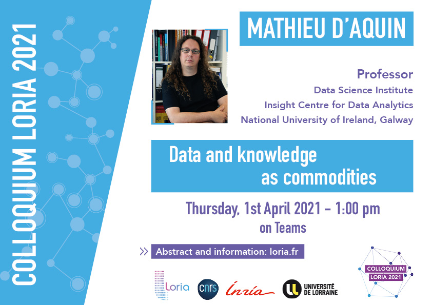 Le colloquium aura lieu le jeudi 1er avril à 13h sur Teams, avec un exposé intitulé “Data and knowledge as commodities”.