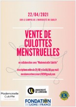 Dans le cadre de notre projet interculturel Mesdames et Messieurs (@instagram :_mesdames_et_messieurs_), traitant de sujets autour de l’égalité homme et femme, nous avons décidé d’organiser une vente de culottes menstruelles à un prix symbolique de 3€. L’argent récolté sera versé à une association partageant l’esprit du projet.