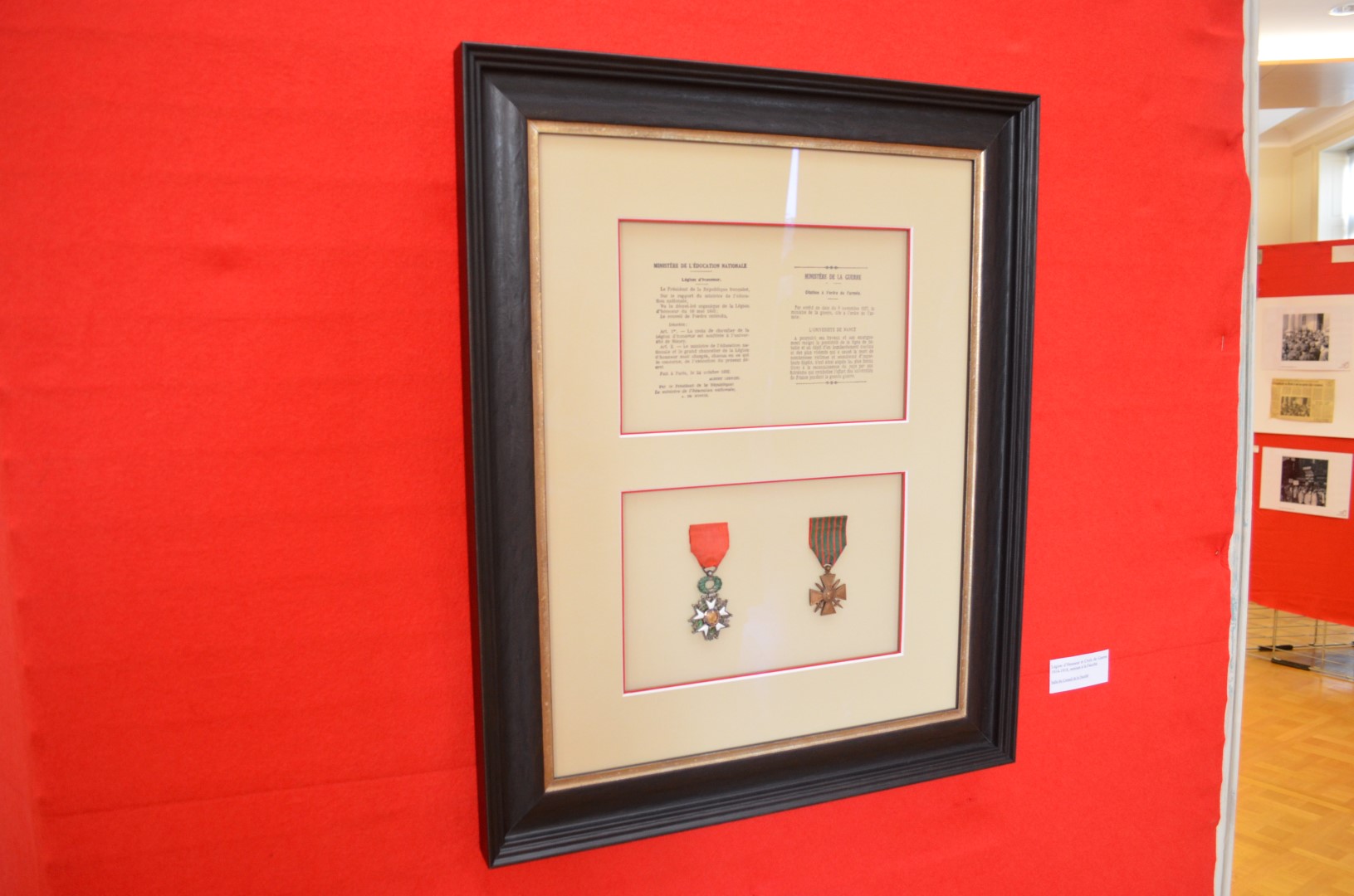 Les médailles de la légion d’honneur et de la croix de guerre à l’Université de Nancy pour son comportement durant la guerre et notamment son courage en continuant d’assurer ses cours |