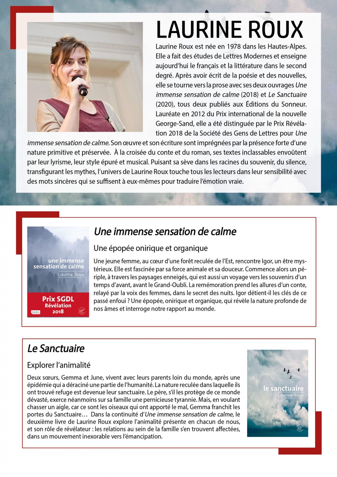 Laurine Roux est née en 1978 dans les Hautes-Alpes. Elle a fait des études de lettres modernes et enseigne aujourd’hui le français et la littérature dans le second degré. Après avoir écrit de la poésie et des nouvelles, elle se tourne vers la prose avec ses deux ouvrages « Une immense sensation de calme » (2018) et « Le Sanctuaire » (2020), tous deux publiés aux Éditions du Sonneur. Lauréate en 2012 du Prix international de la nouvelle George-Sand, elle a été distinguée par le Prix Révélation 2018 de la Société des Gens de Lettres pour « Une immense sensation de calme ». Son œuvre et son écriture sont imprégnées par la présence forte d’une nature primitive et préservée. À la croisée du conte et du roman, ses textes inclassables envoûtent par leur lyrisme, leur style épuré et musical. Puisant sa sève dans les racines du souvenir, du silence, transfigurant les mythes, l’univers de Laurine Roux touche tous les lecteurs dans leur sensibilité avec des mots sincères qui se suffisent à eux-mêmes pour traduire l’émotion vraie.
