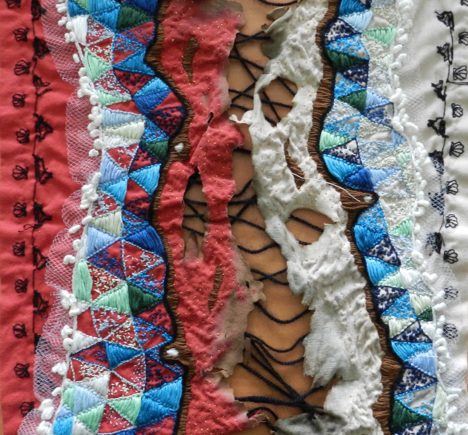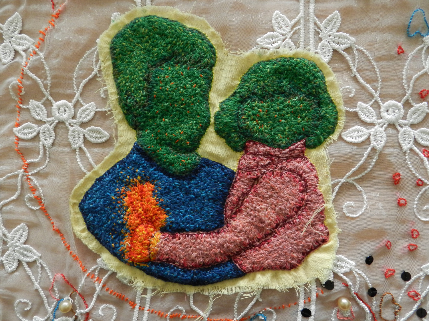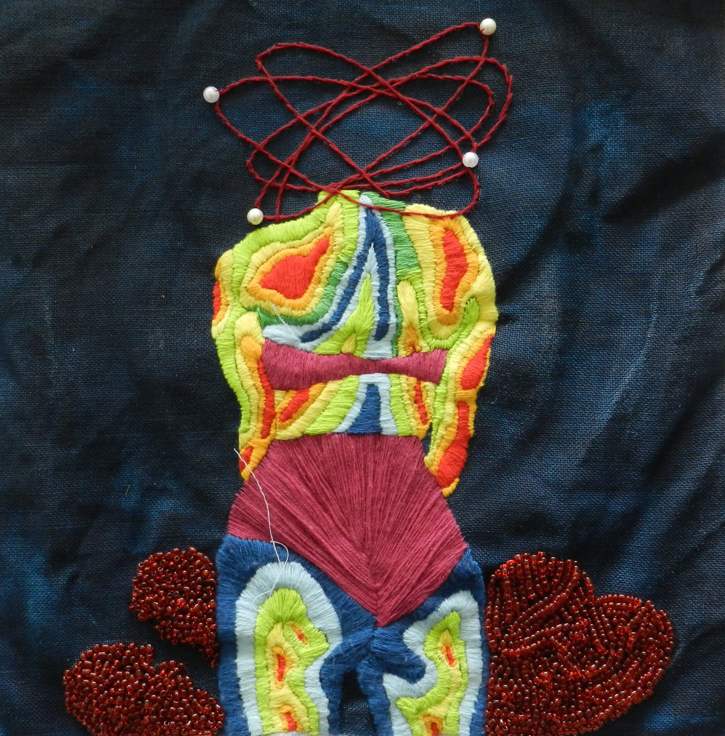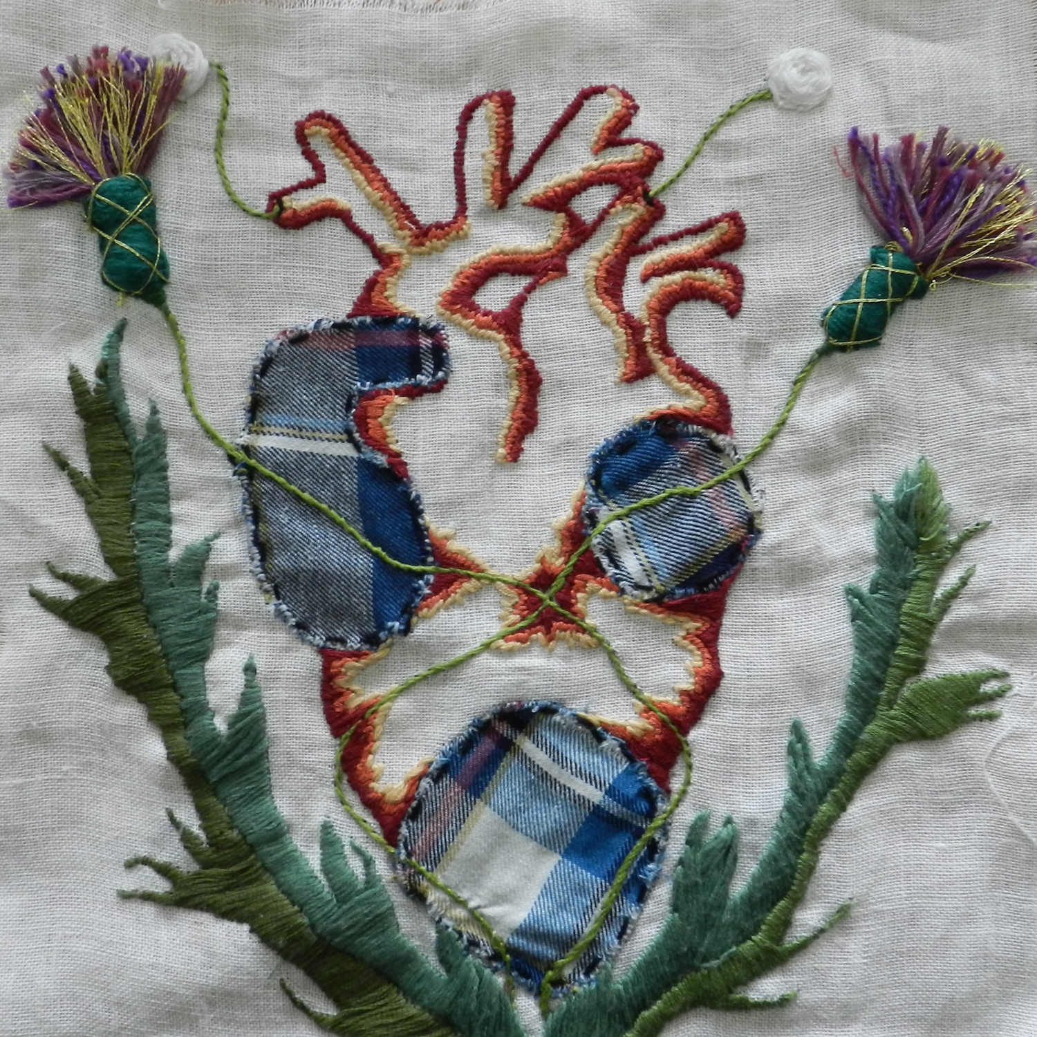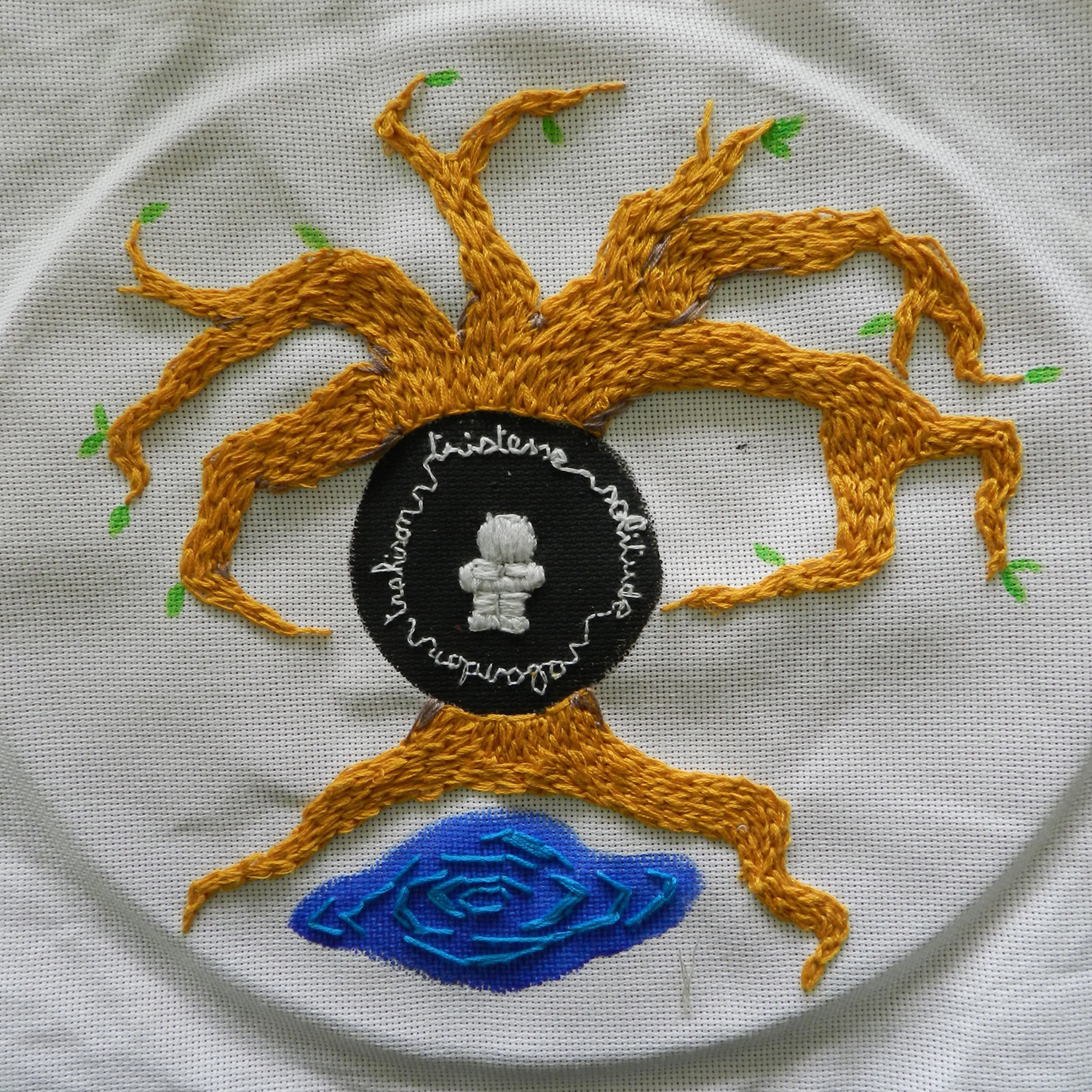 Dans le cadre d'un TD intitulé "Initiation aux techniques graphiques contemporaines", les étudiants de la licence 2 Arts Plastiques ont travaillé sur un projet de broderie. Certains n'avaient jamais utilisé ces techniques du fil, qui sont souvent mises en lien avec le travail des femmes et peu valorisées. Ce sujet avait donc pour but de dépoussiérer cette image attribuée à la broderie et de permettre aux étudiants de s'approprier les techniques du fil selon un projet défini au préalable par la réalisation d'un carton (dessin permettant de retranscrire le projet, les couleurs, les formes, les points et les matières utilisés). Chaque broderie est composée dans un format carré de 30 x 30 cm et répond à ce qu'on appelle une "mythologie personnelle", c'est-à-dire un travail qui fait référence au vécu, à l'histoire intime, au souvenir et à la mémoire. Cette exposition restitue donc l'ensemble des travaux qui ont été produits ces deux derniers mois.