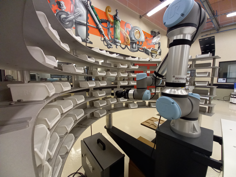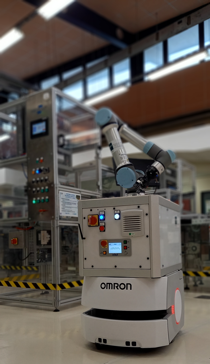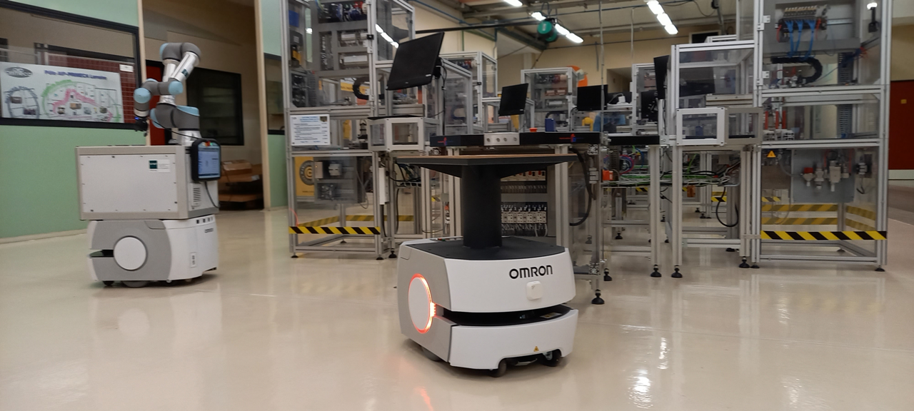 La logistique d’atelier fait appel désormais à 2 robots mobiles industriels LD-60 de chez OMRON [ix](4 km/h, 60 kg, navigation par cartographie laser. L’un des deux est équipé d’un robot collaboratif UR-5e, l’autre étant en cours d’équipement d’une simple matrice d’emplacements de stockage. Plusieurs niveaux de complexité de travaux pratiques sur ces robots sont possibles :