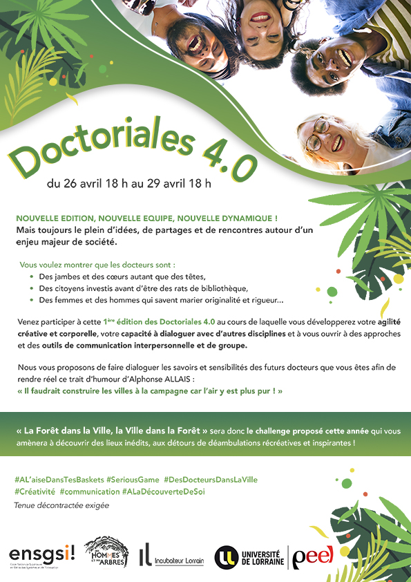 Du 26 avril 18h au 29 avril 18h, des Doctorants de l'Université de Lorraine participeront à cette 1ère édition des Doctoriales 4.0 au cours de laquelle ils développeront leur agilité créative et corporelle, leur capacité à dialoguer avec d'autres disciplines et à s'ouvrir à des approches et des outils de communication interpersonnelle et de groupe.