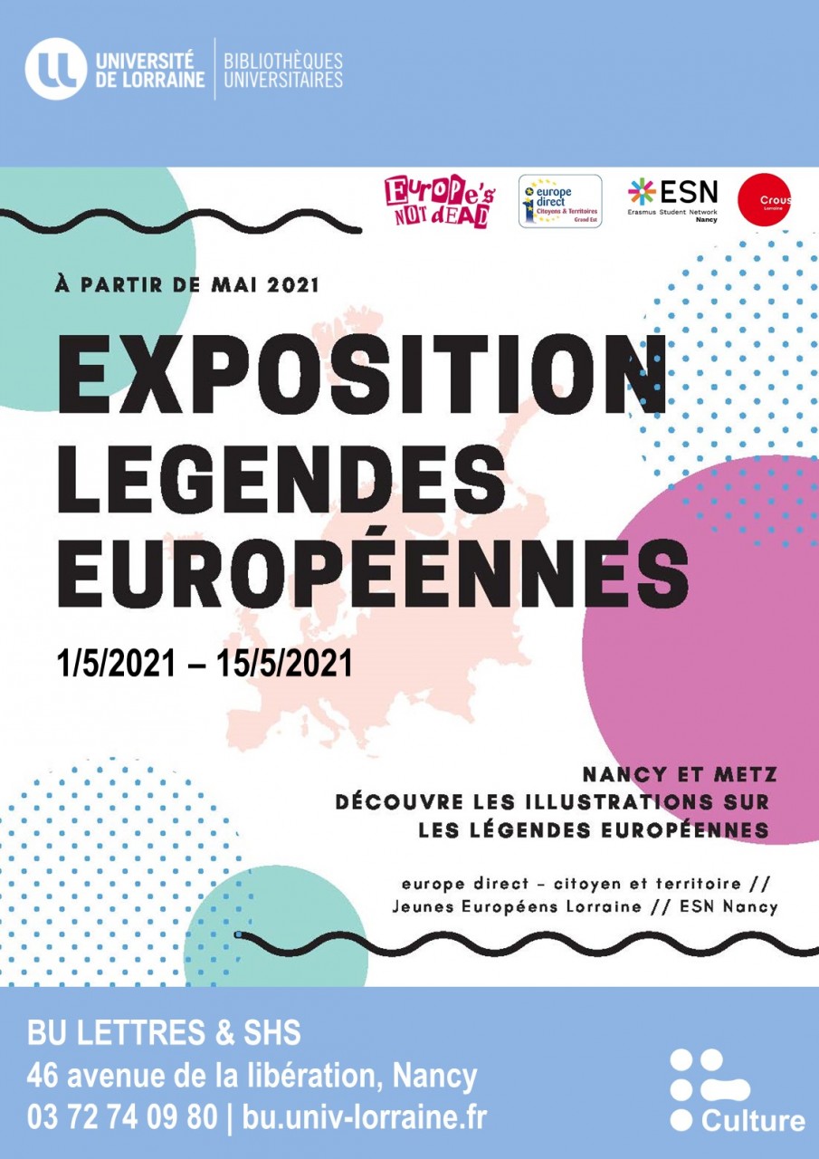 Le mois de mai célèbre la construction européenne ! A cette occasion et dans le cadre de l’action «En mai, faites l’Europe » lancée par la ville de Nancy, les associations ESN Nancy, Europe Direct Territoires Lorrains et les Jeunes Européens - Lorraine organisent une exposition centrée sur les mythes et légendes qui puisent leur origine dans les pays de l’Union Européenne.