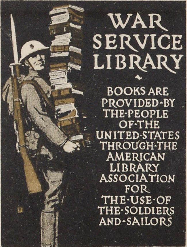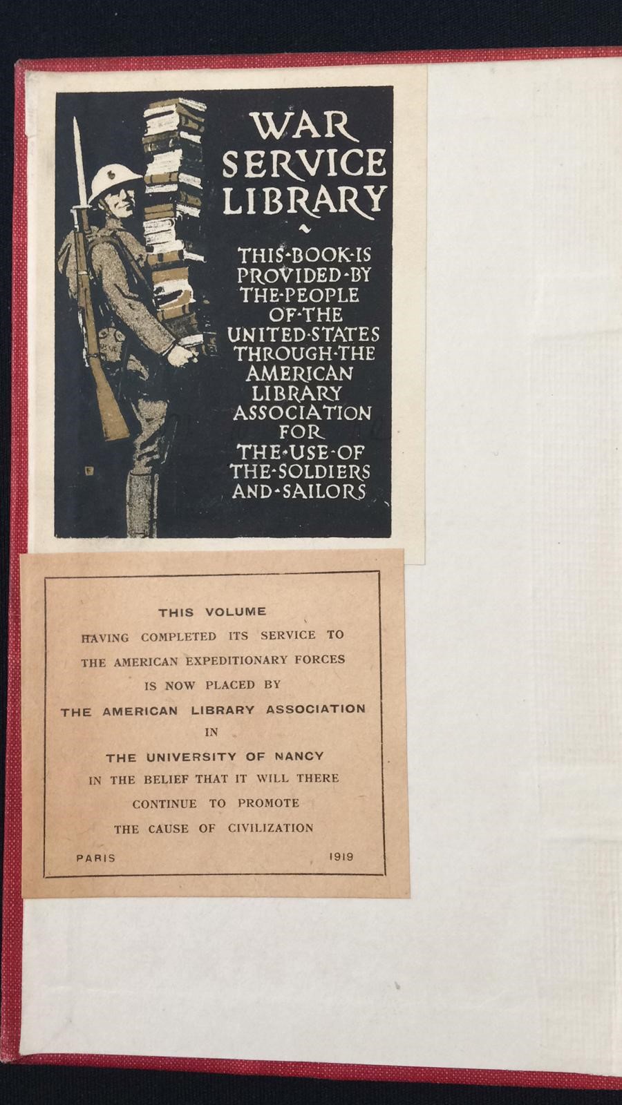Cependant, une collection précieuse de livres provenant de la Bibliothèque Américaine à Paris et aujourd'hui conservés dans les fonds des Bibliothèques universitaires de Nancy témoigne des relations anciennes entre les deux institutions. Cet ensemble de livres fait partie des premiers ouvrages envoyés aux troupes américaines stationnées sur le sol français. Ils présentent tous une étiquette sur la page de garde ; elle montre un soldat souriant muni d’un fusil à baïonnette et d’une haute pile de livres : les deux objets les plus précieux pour ces hommes que la mort et la vie se disputaient [Fig. 2].