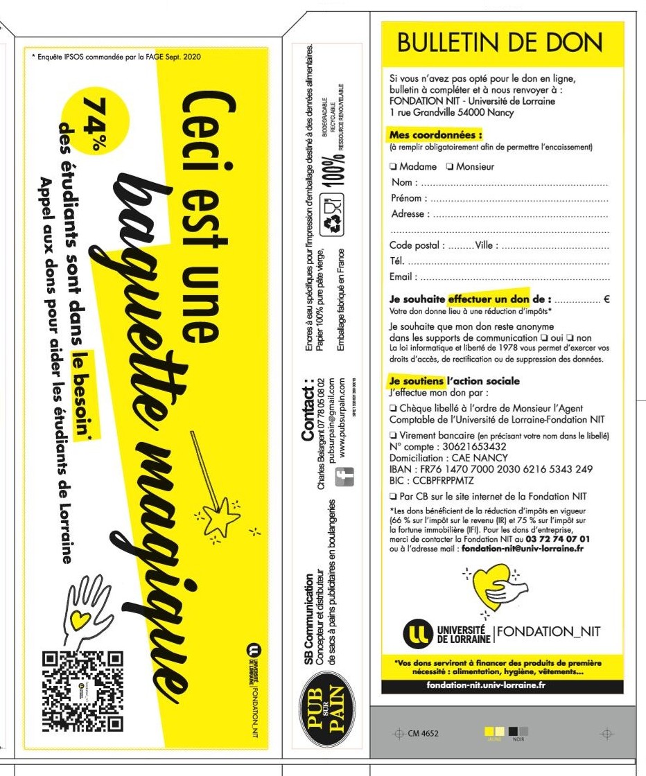 Les deux premières campagnes d’appel aux dons ont permis de récolter 40 000€ pour l’aide sociale étudiante, auprès d’entreprises et de donateurs particuliers sensibles à cette cause. Nous leur exprimons ici notre profonde gratitude de la part de tous les étudiants bénéficiaires. Cependant la situation économique nous amène à les solliciter à nouveau en leur demandant de partager cette campagne le plus largement possible car les besoins sont immenses. Le succès de la campagne réalisée à l’aide d’une communication sur des sacs à pain nous incite à renouveler l’opération en l’amplifiant de Metz à Épinal. De ce fait, davantage de boulangeries distribueront des sacs à pain à partir du samedi 8 mai.