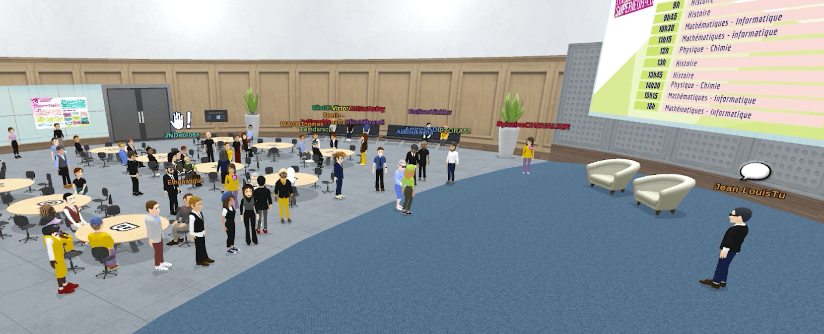 Le 16 mars, les lycéens ont donc pu se déplacer dans ce campus virtuel, aller d’une salle à un amphi pour assister aux présentations de leur choix, rencontrer des camarades, parfois d’autres lycées que le leur, discuter avec des étudiants ambassadeurs, etc. (Voir la vidéo)