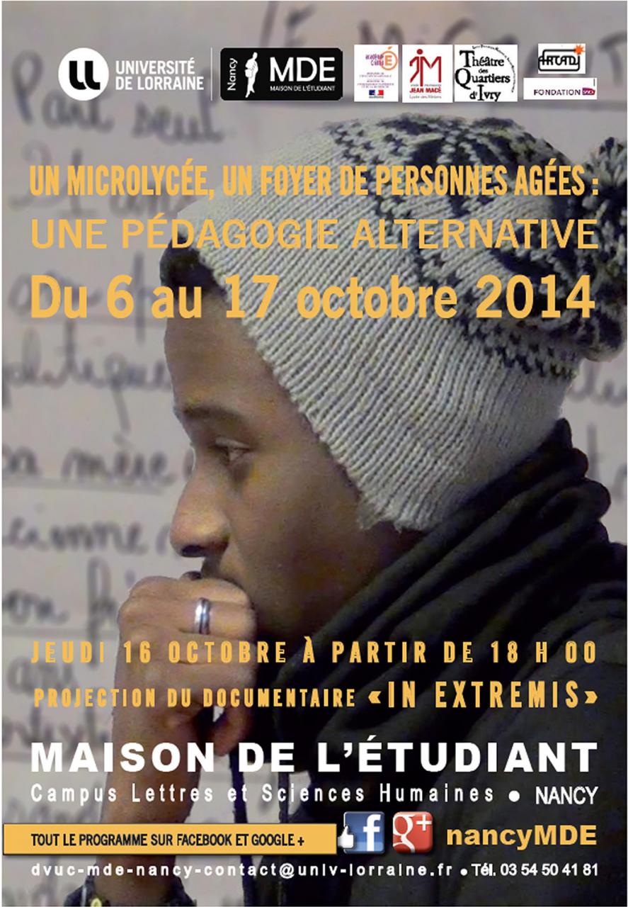 En présence de Colette Ouanounou, la réalisatrice, et de Florence Lhomme, professeur au Microlycée de Vitry-sur-Seine, nous vous proposons de suivre le parcours de ces jeunes et de ces anciens au cours de la projection du documentaire qui aura lieu à la MDE le jeudi 16 Octobre à 18h. Un débat sur les méthodes pédagogiques adoptées au sein du Microlycée et sur les procédés de création documentaire sera organisé après la projection.