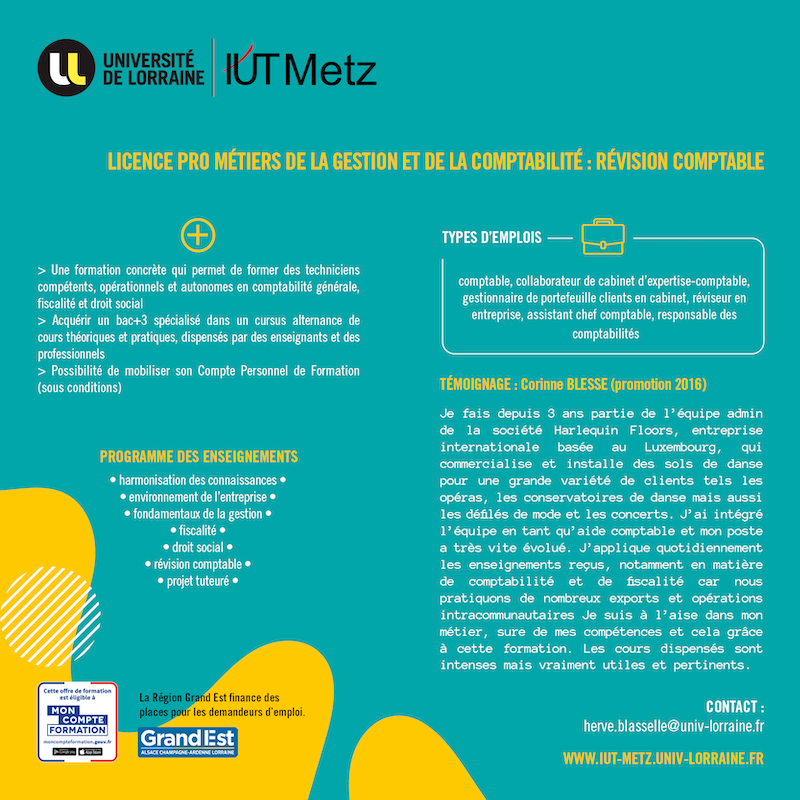 La Licence professionnelle MGC - Révision comptable de l’IUT de Metz est une formation concrète qui permet de former des techniciens compétents, opérationnels et autonomes en comptabilité générale, fiscalité et droit social. Une nouvelle promotion est attendue dès le 1er octobre 2021.