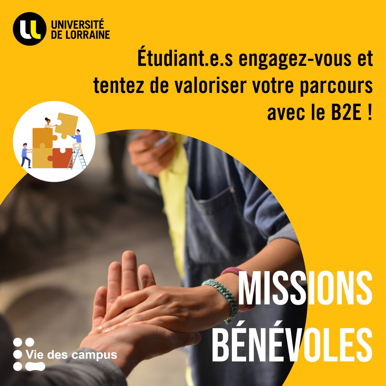 Ce type d’expérience peut être valorisé au titre du B2E – Bonus Engagement Étudiant. Le B2E permet la reconnaissance de compétences acquises lors de votre engagement durant votre parcours à l’Université de Lorraine, dans l’un de ces domaines : Vie associative, Arts & culture, Citoyenneté, Promotion de la santé, Mandat électif. Le B2E est un dispositif validé par le Conseil de la Formation et le Conseil de la Vie Universitaire. Le bonus proposé est "à disposition" du jury qui reste souverain quant à son attribution finale. Le bonus ne peut être attribué aux étudiants inscrits dans le cadre des concours. La valorisation d'un engagement n'est possible qu'une seule fois par année universitaire et par diplôme.