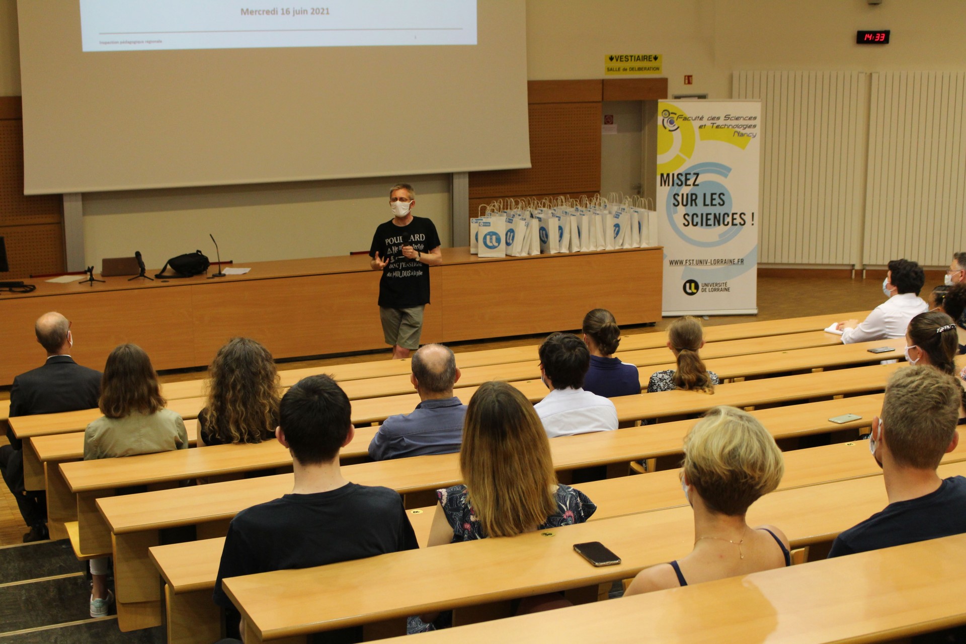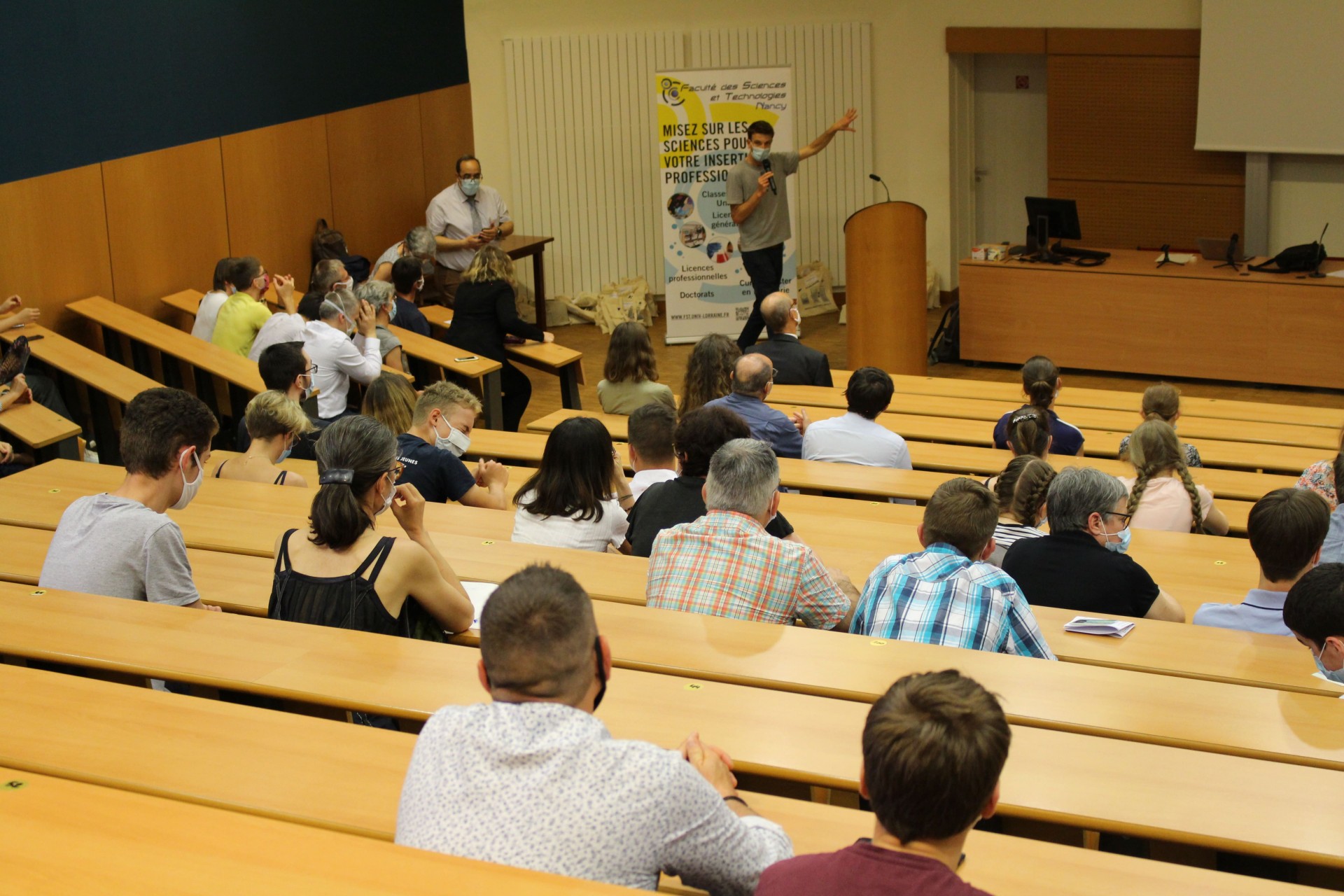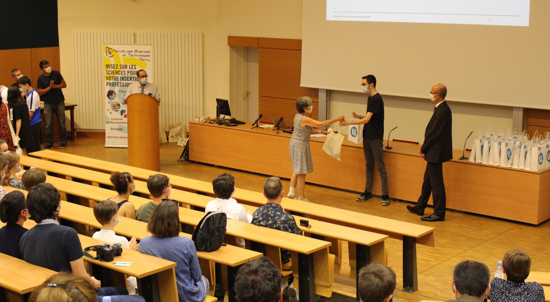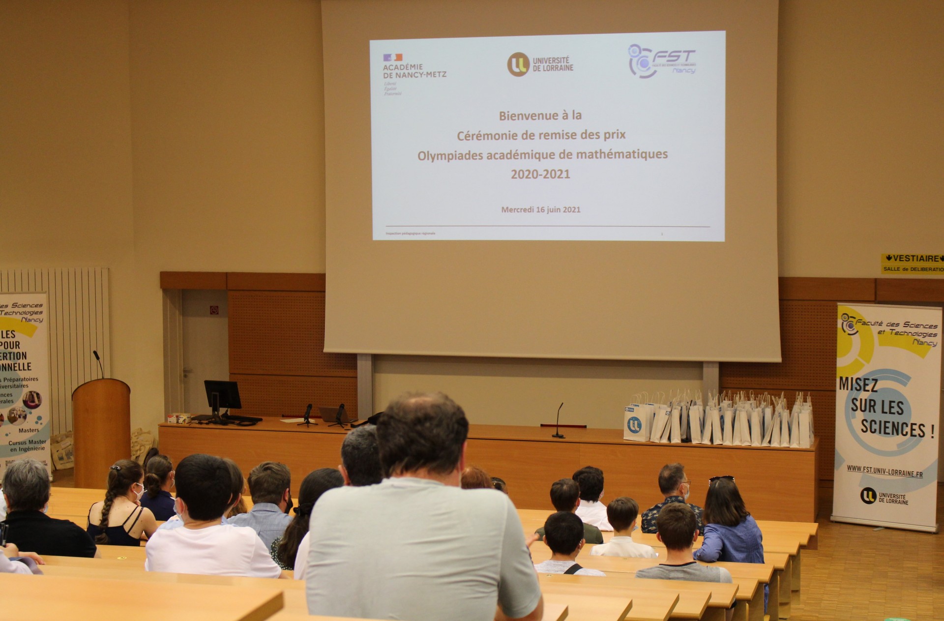 Parents, collégiens, lycéens et professeurs se sont réunis mercredi 16 juin 2021 dans l’amphi 8 de la Faculté des Sciences et Technologies à Vandœuvre-lès-Nancy pour récompenser les vainqueurs des Olympiades de mathématiques de 4e et de 1re. Plus de 1 393 élèves ont participé à cette compétition qui contribue au rayonnement des mathématiques et au développement de la démarche scientifique auprès des jeunes.